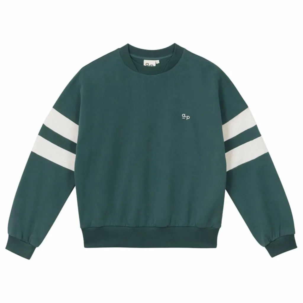 - Sweat femme a bandes . – Molleton en coton bio et brosse. – Col rond et coupe loose. – Manches longues. – Bandes contrastees aux bras. – Finition bord cote au col, poignets et bas du corps. – Broderie AP a la poitrine. – etiquette » pois bleu » cousue a la couture cote. – Existe en coloris vert foret et cobalt.