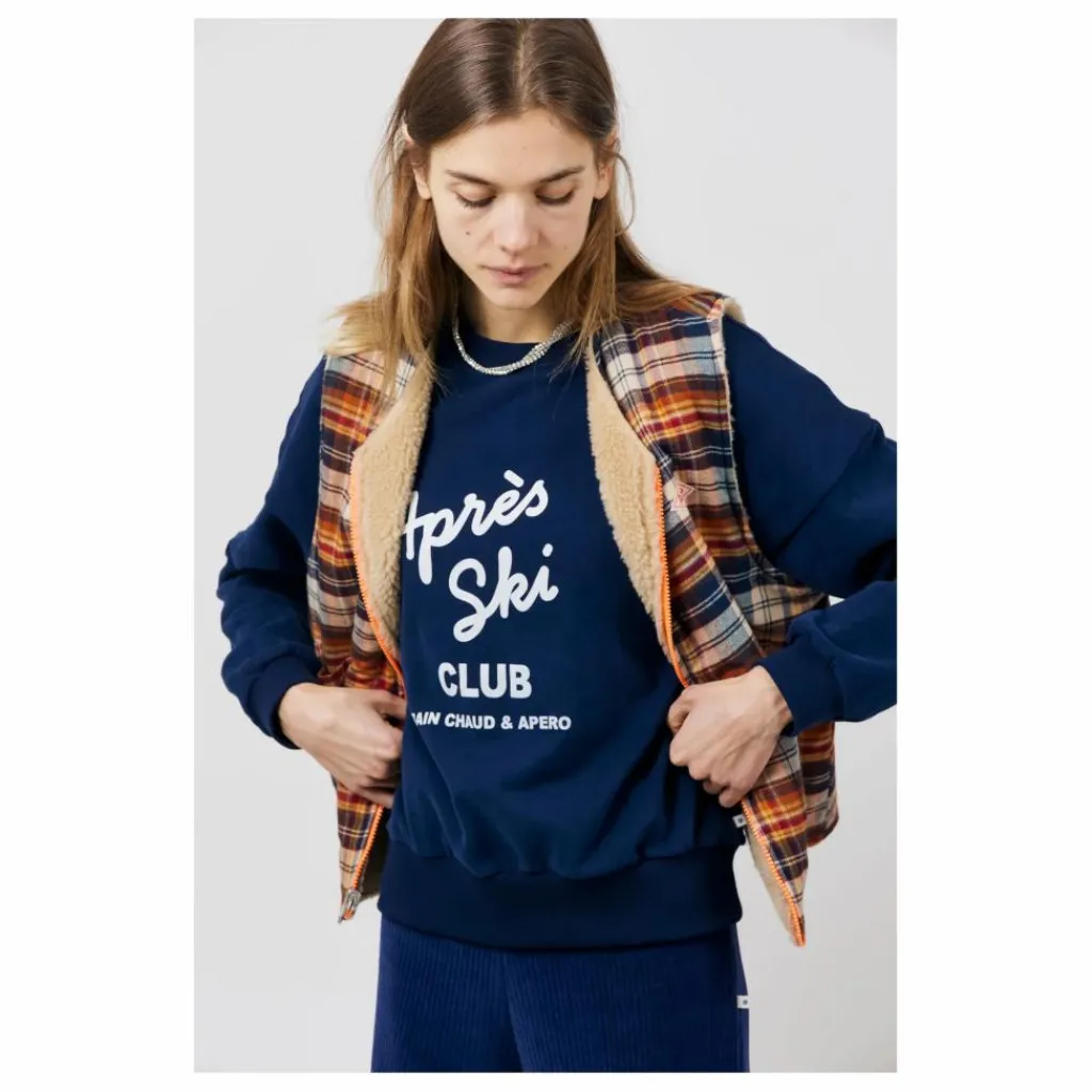 - Veste femme sans manches reversible . – Un cote a carreaux ecossais, avec des poches plaquees. – Etiquette « AP & CO » a la poitrine. – Un cote en sherpa. – Mi-longue. – Ouverture avec un zip contraste orange au milieu devant. . – Petite etiquette « pois bleu » cousue au cÙtÈ.