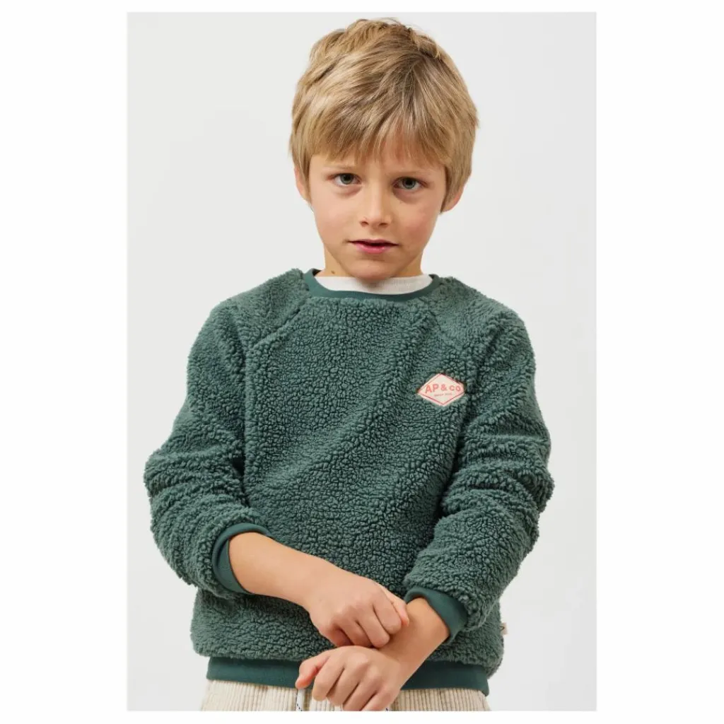 - Sweat relax en sherpa . – Col rond. – Manches raglans. – Etiquette « AP & CO » sur le devant. – etiquette petit drapeau cousue a la couture cote. – Existe en coloris vert et marron. – H25GS01