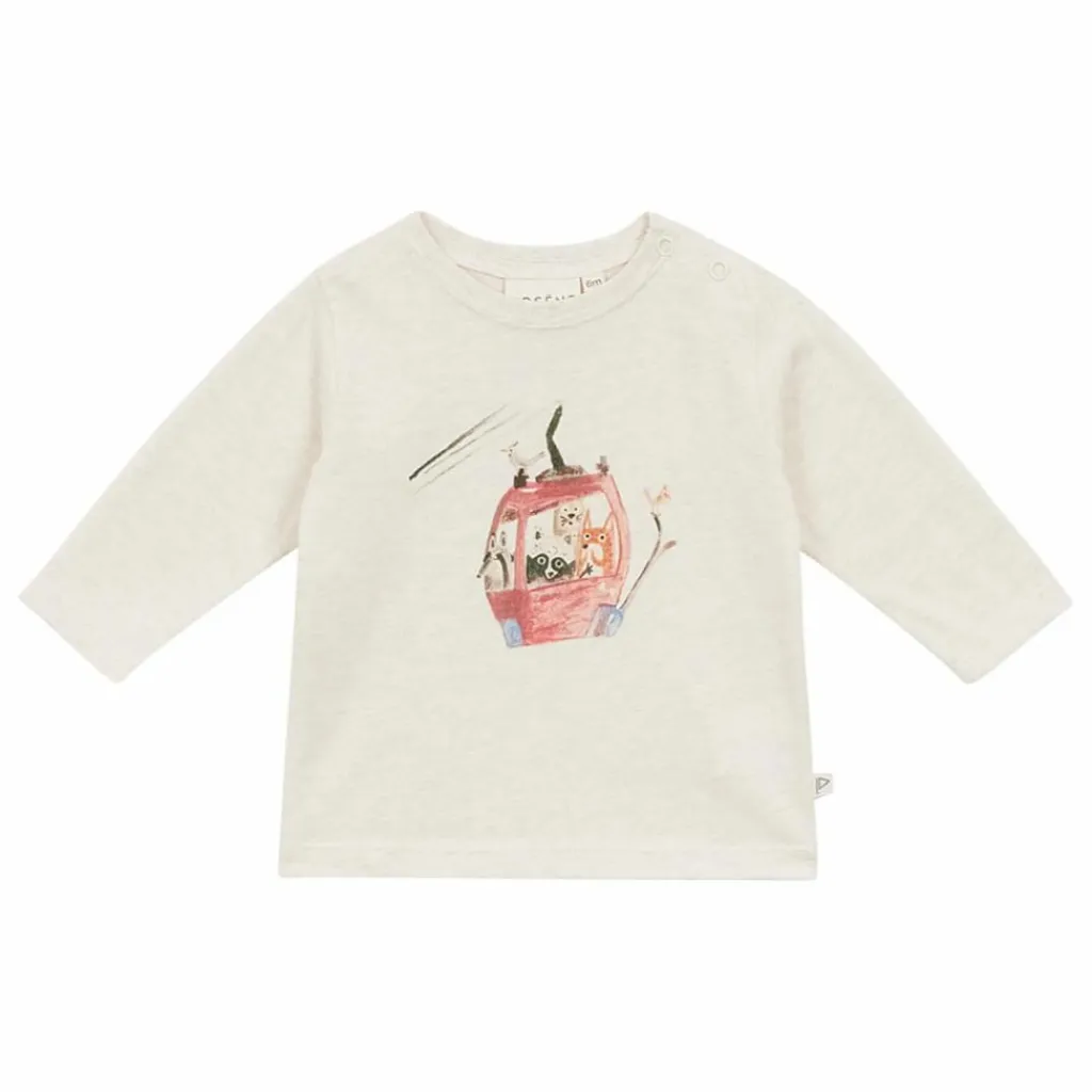 - Tee-shirt bebe . – Jersey en coton bio. – Manches longues. – Finition bord cote au col. – Ouverture pressionnee a l epaule. – Impression aquarelle « Telecabine » au devant. – etiquette petit drapeau cousue a la couture cote. – H25BT07