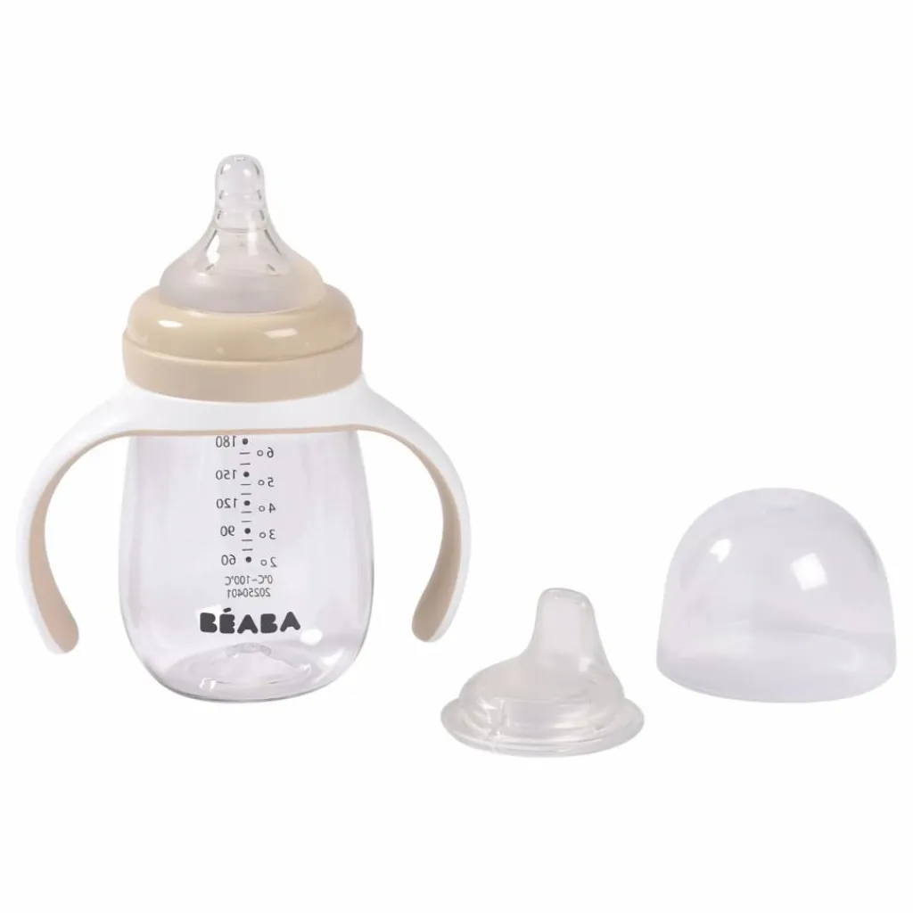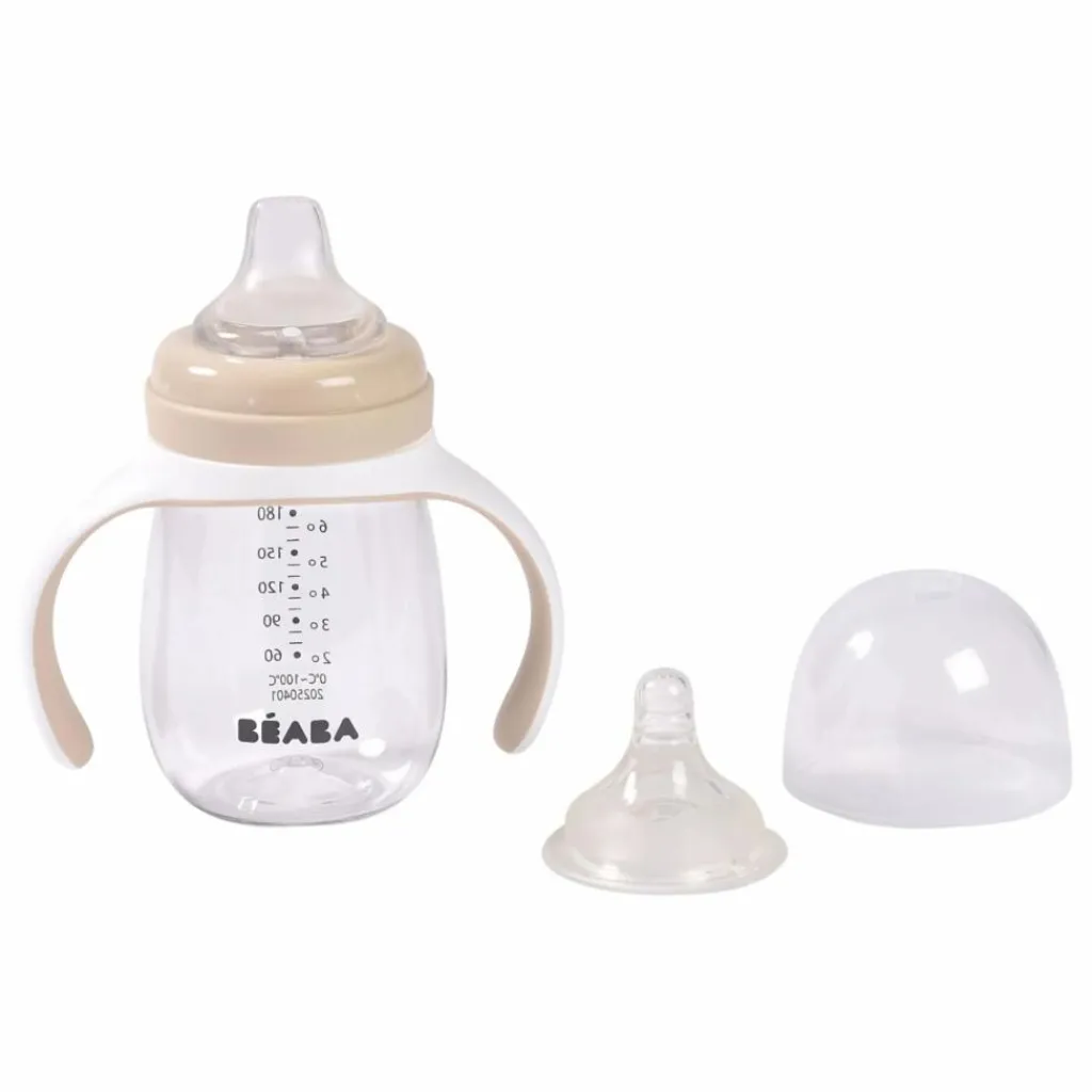 - Le biberon d’apprentissage 2 en 1 (210 ml) de BÉABA® permet aux plus jeunes d’apprendre à boire seul librement dès 4 mois.