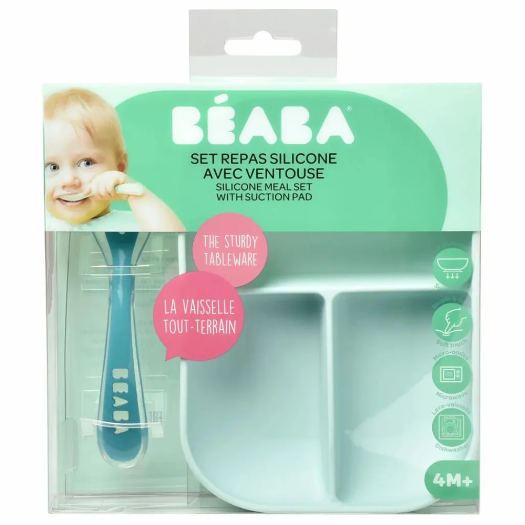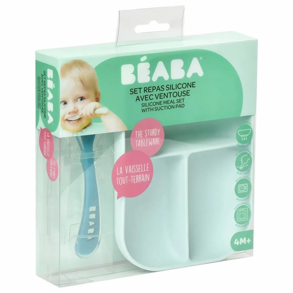 Le coffret repas a été entièrement conçu en silicone, avec un souci ergonomique pour faciliter l’apprentissage des repas, en toute sérénité. L’assiette compartimentée permet de préserver les saveurs de chaque aliment et de séparer les différentes textures. Sa ventouse permet d’adhérer à la table et d’éviter les incidents. La cuillère 2ème âge, elle, est adaptée aux mains d’enfant.