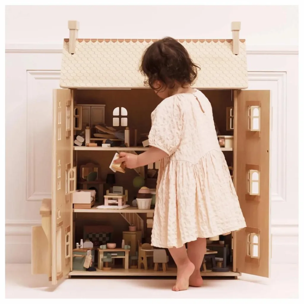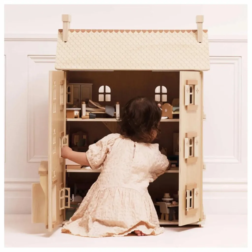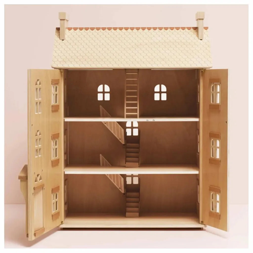 - Découvrez une maison de poupée d’exception, entièrement réalisée en bois durable certifié FSC™. Avec ses quatre étages, ses fenêtres, volets, portes et toit ouvrants, cette splendide demeure offre un cadre idéal pour des heures d’histoires et de jeux imaginatifs.