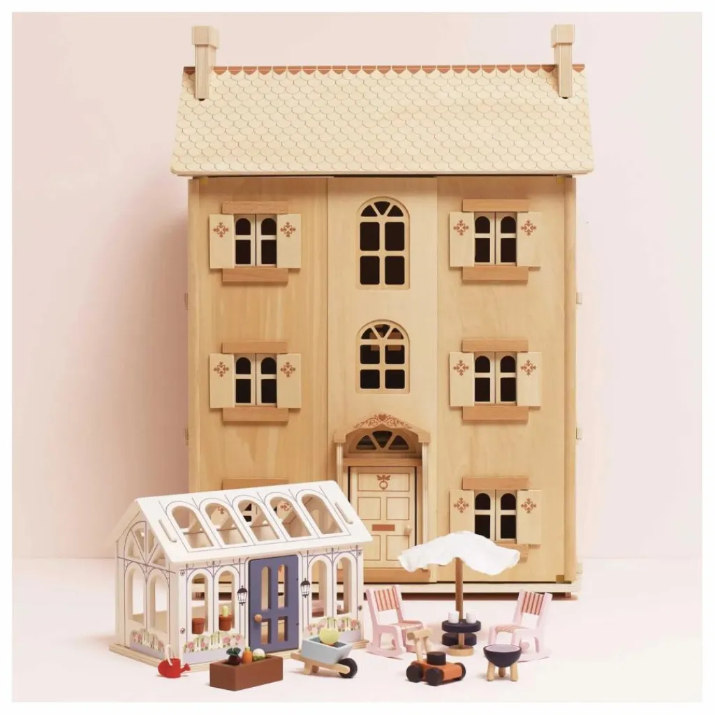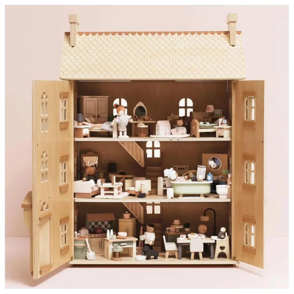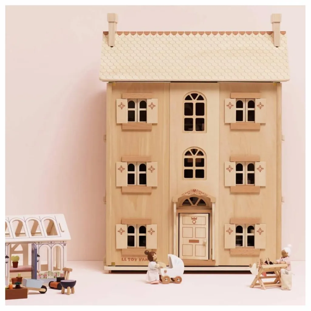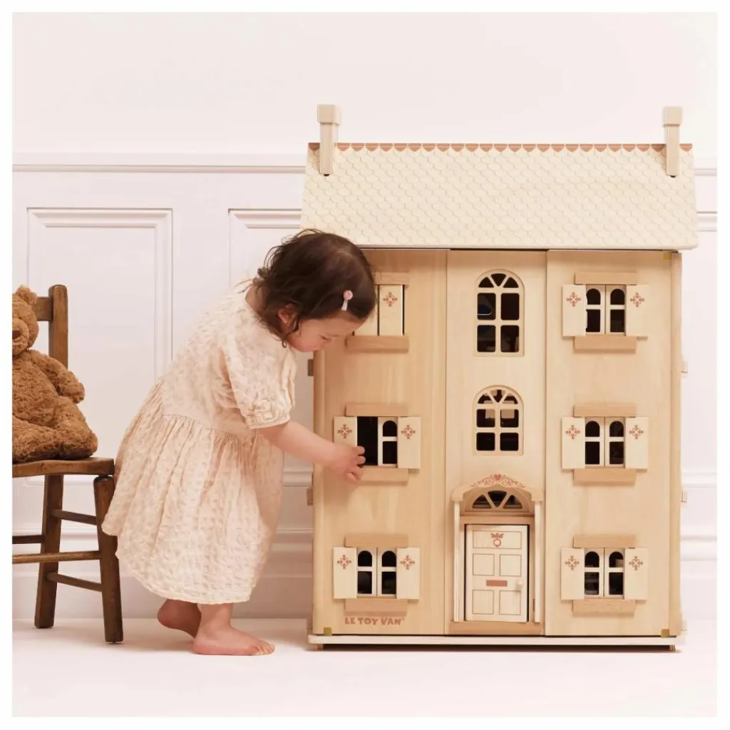 - Découvrez une maison de poupée d’exception, entièrement réalisée en bois durable certifié FSC™. Avec ses quatre étages, ses fenêtres, volets, portes et toit ouvrants, cette splendide demeure offre un cadre idéal pour des heures d’histoires et de jeux imaginatifs.