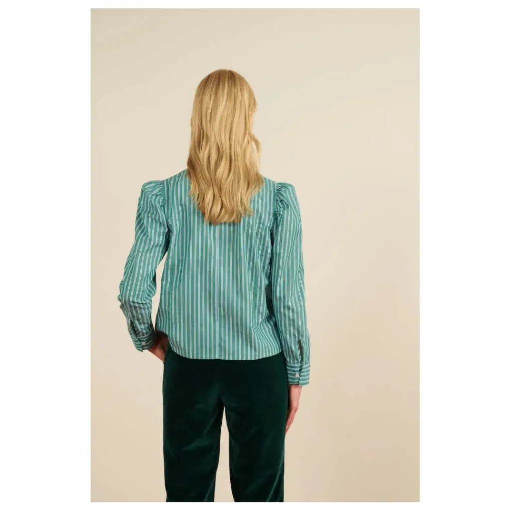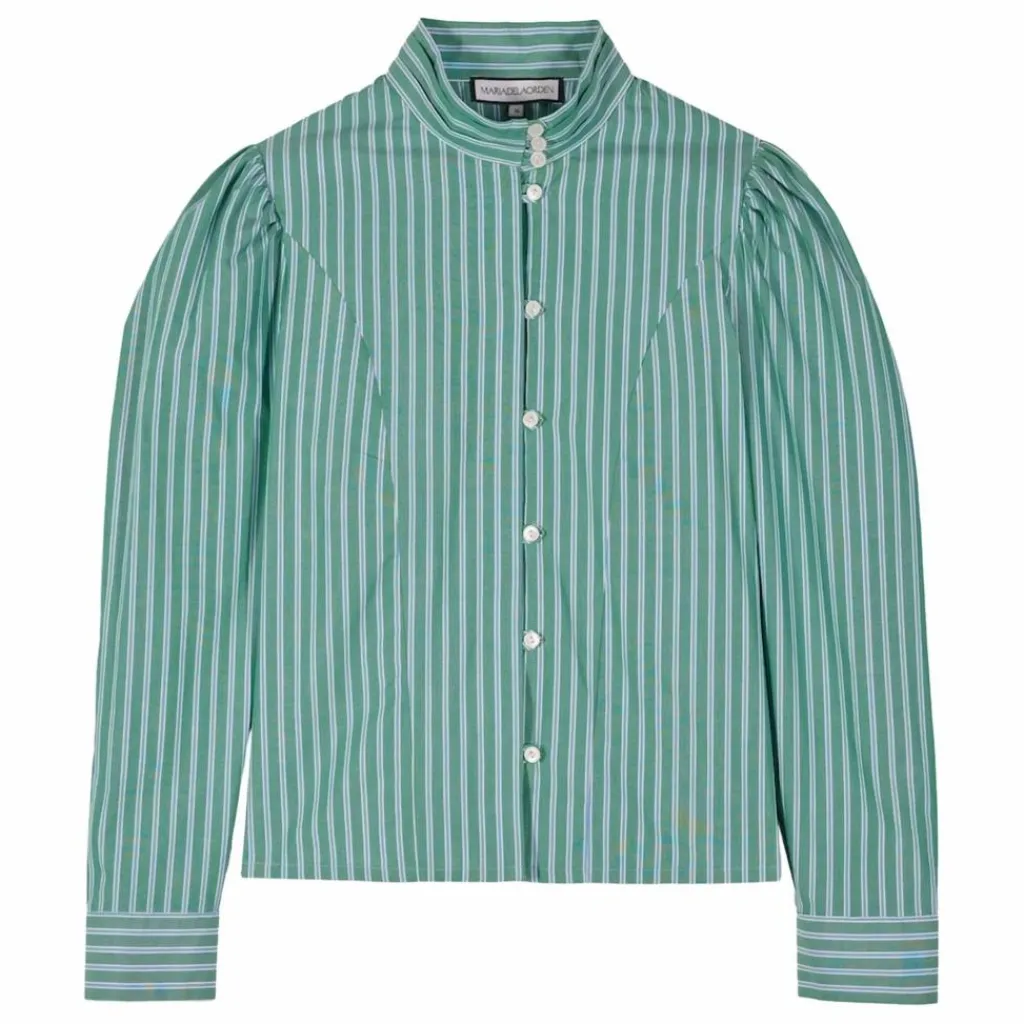 - La chemise Iza a une coupe régulière inspirée de la mode mandarine – Elle présente un col Mao et des boutonnières orientales – Elle est dotée de manches bouffantes – Elle est confectionnée en coton rayé vert et blanc.
