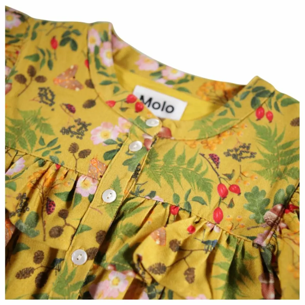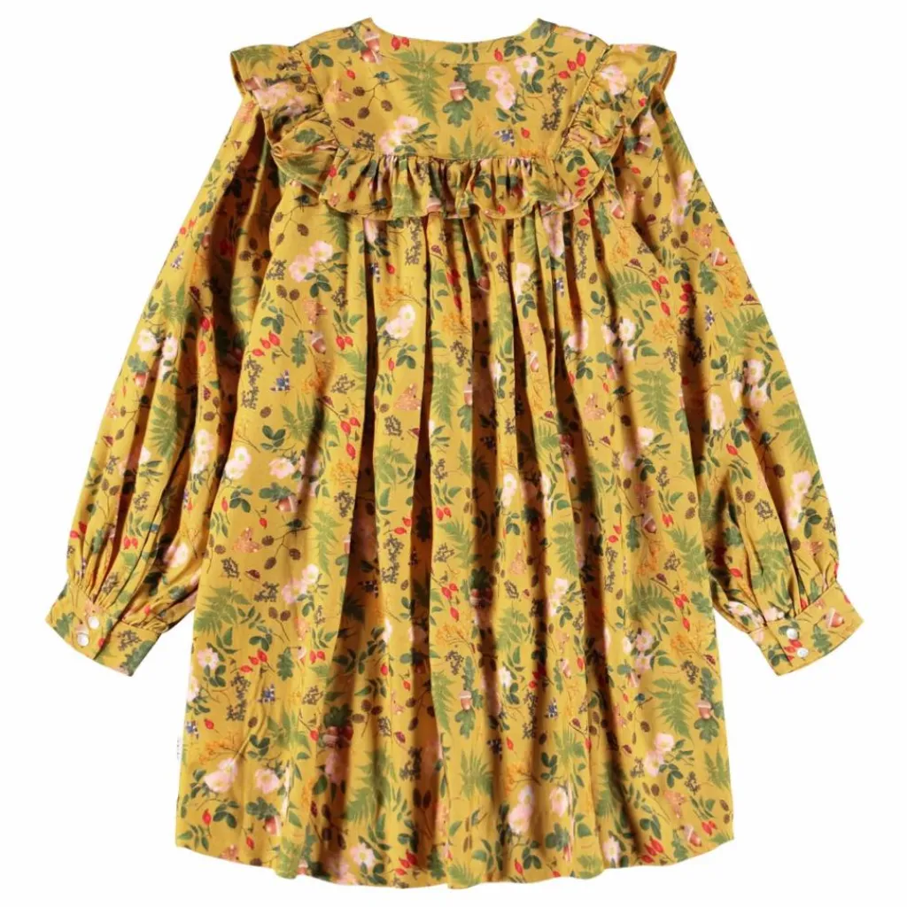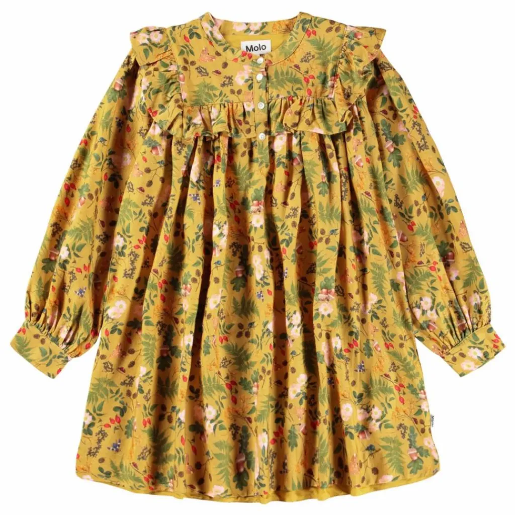 - Cette robe jaune à manches longues de Molo est confectionnée en viscose douce et présente un joli drapé. Elle présente une encolure ronde avec de petits boutons sur le devant, des manches longues avec du volume, des volants sur l’épaule et un empiècement. Elle a une coupe ample et un imprimé de feuilles, de noix et de fleurs.