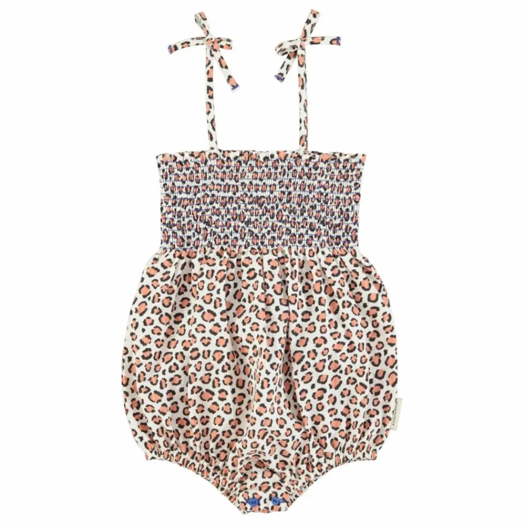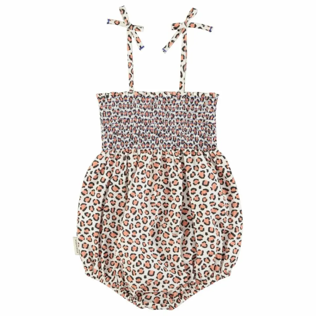 - Grenouillère pour bébé avec un motif fumé sur la poitrine. Poignets élastiqués. Boutons bleus à l’entrejambe.