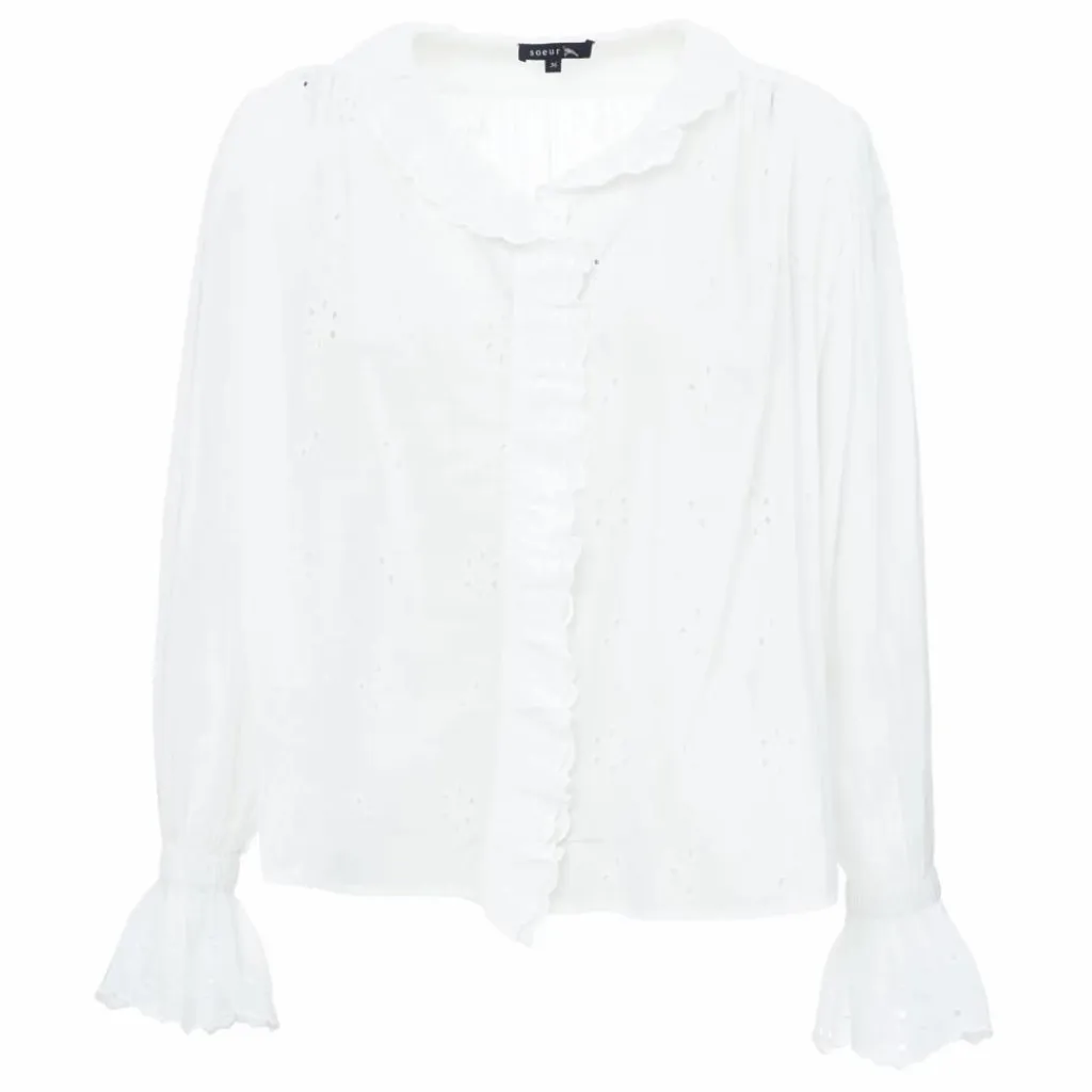 - Resserré aux poignets, Manches bouffantes, Manches longues, Poignets volantés, Volanté, Froncé aux épaules, Ajouré(s), Col montant, Col volanté