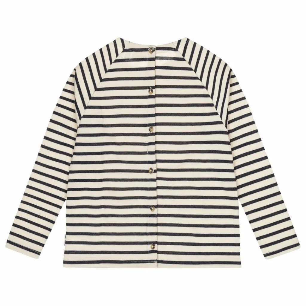- Cette chemise à manches longues rayée bleu foncé et blanc se ferme par un bouton pratique dans le dos. Les rayures colorées sont agrémentées d’un subtil fil de lurex.