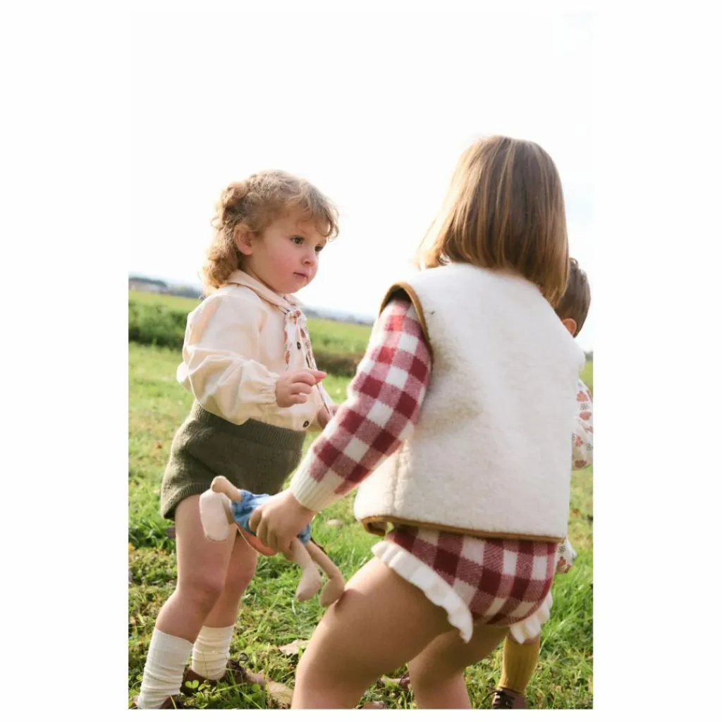 - Combinaison en maille jacquard Vichy avec boutons sur le devant. Bretelles et volants contrastés.