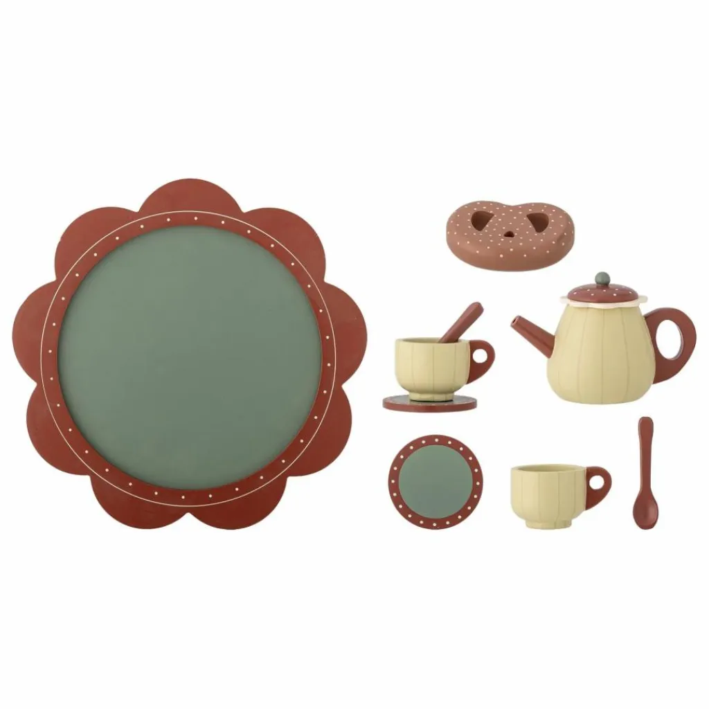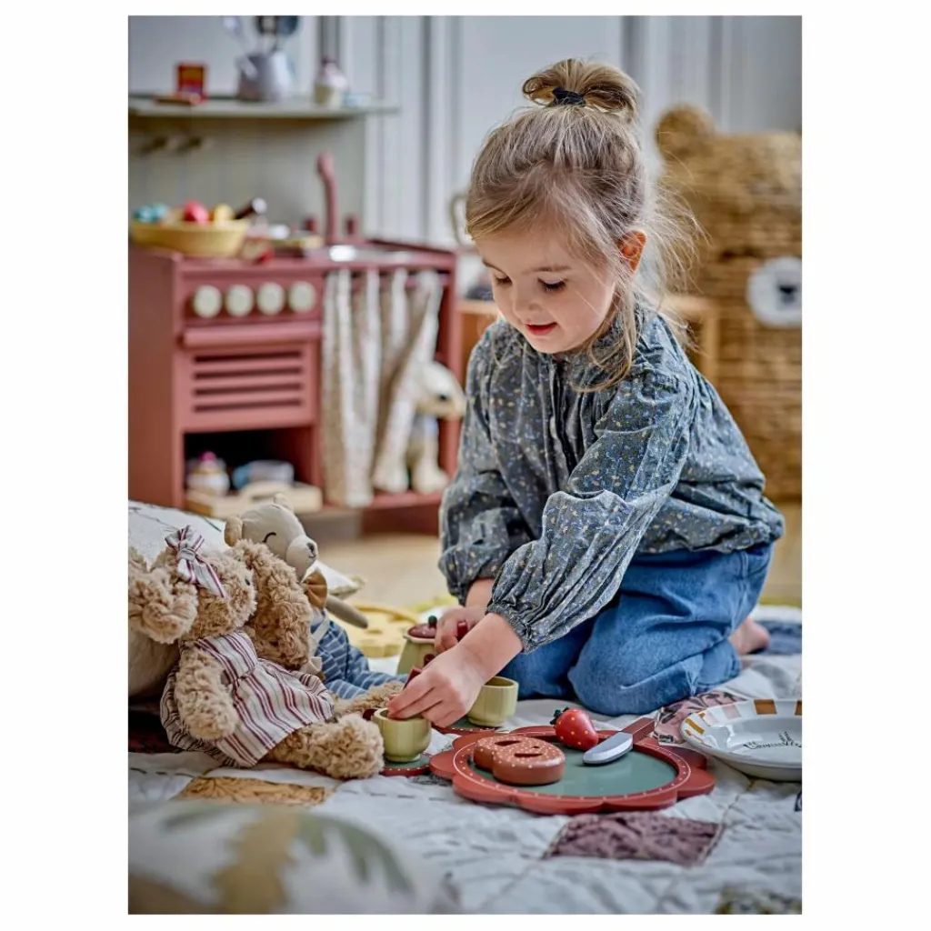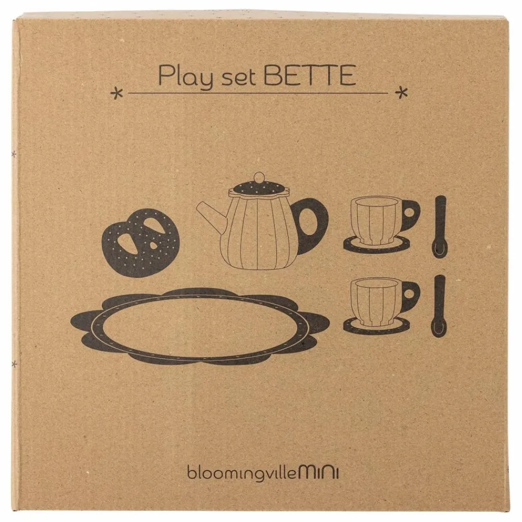 - Le Set de jeu Bette de Bloomingville MINI se compose de plusieurs pièces formant un service à thé. Ce joli set aux couleurs douces comprend 9 pièces, toutes fabriquées en bois certifié FSC. Le set comprend : un plateau, une théière, des tasses, des soucoupes, des cuillères et un bretzel. Avec ce service à thé et le plateau fleuri, les enfants peuvent jouer et inviter leurs nounours et amis à un goûter.
