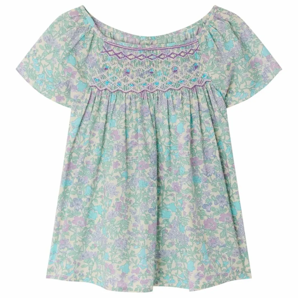 - Confectionnée en coton biologique, cette blouse pour fille Grenade se démarque par son ravissant tissu Liberty et ses smocks brodés à la main sur le devant. Elle comporte une fente boutonnée au dos.