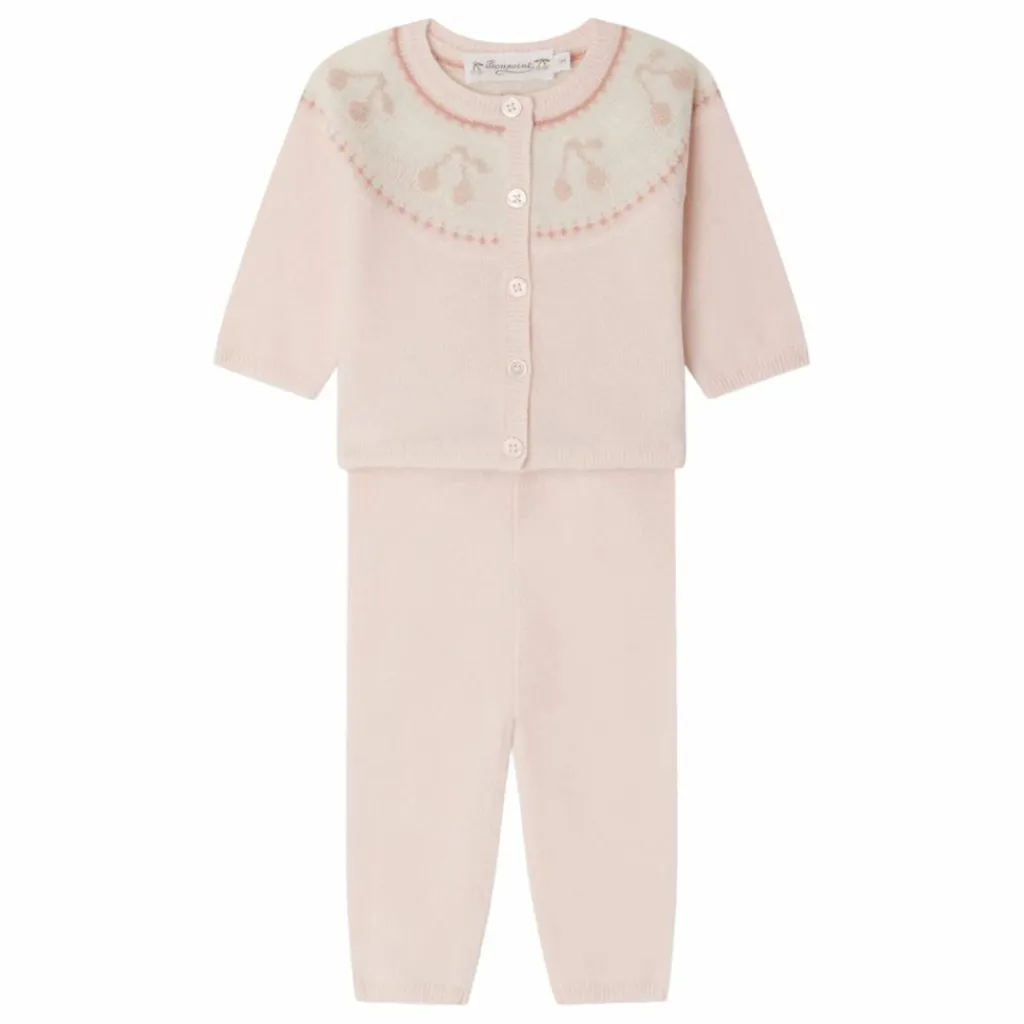 - L’ensemble Jenny pour bébé est idéal pour rester au chaud et bénéficier d’un confort optimal. Il se pare d’un ravissant motif de cerises en jacquard sous l’encolure.En laine et cachemire certifiés qui garantissent le bien être animal Ouverture boutonnée devantFinitions bords-côtesDétails métallisés