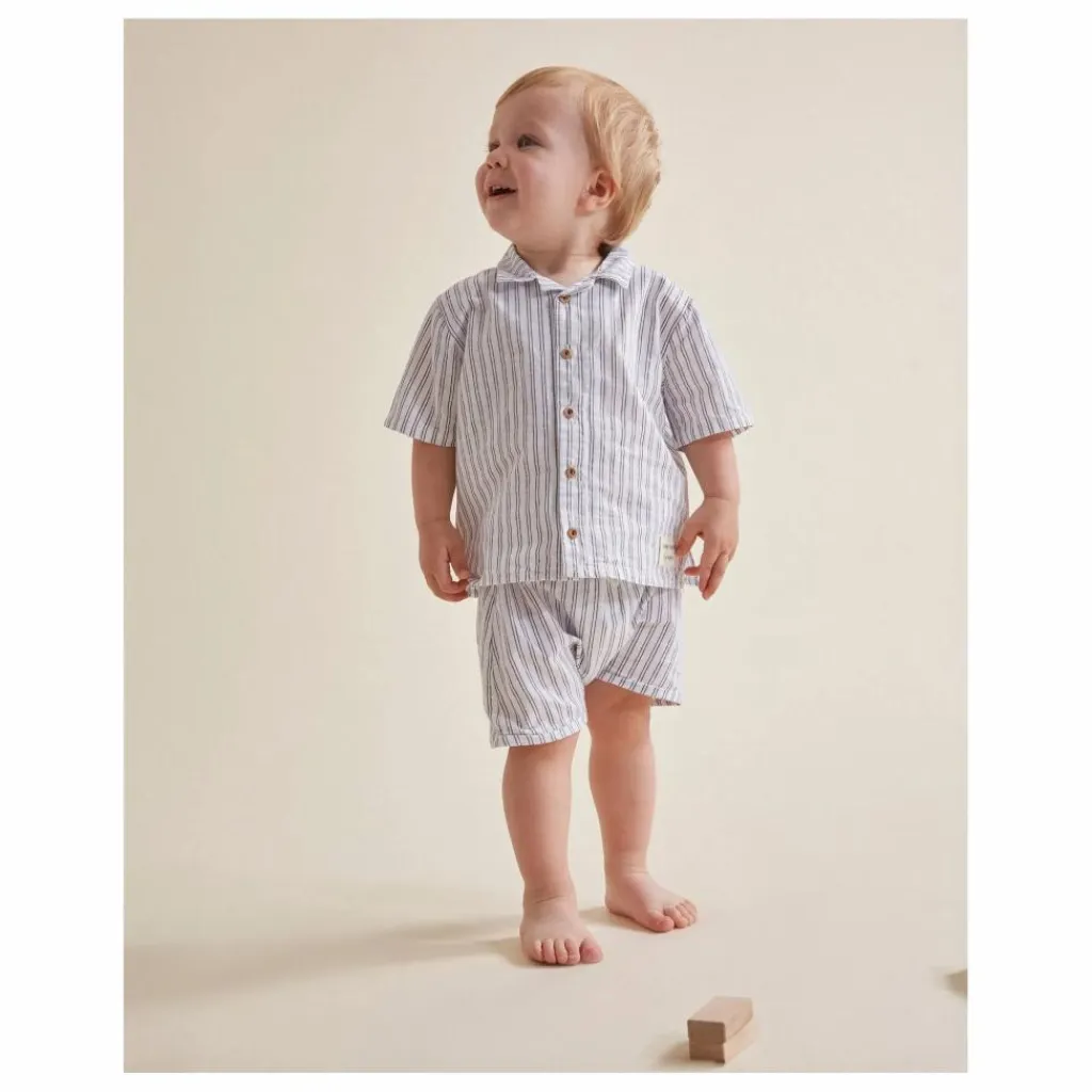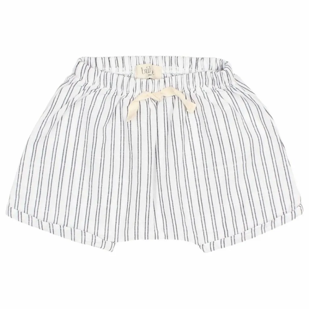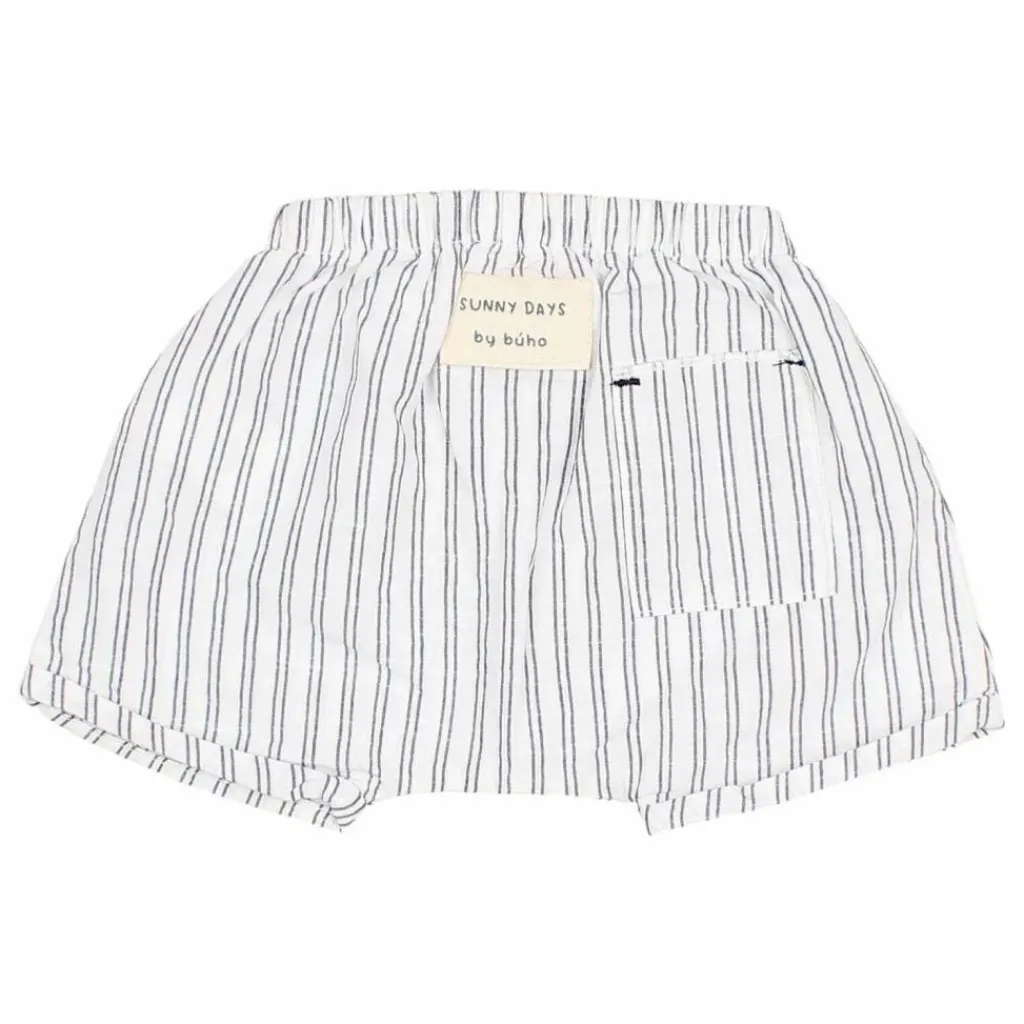 - Short rayé. Taille élastiquée avec cordon de serrage. Ourlet retourné. Étiquette décorative et poche arrière.