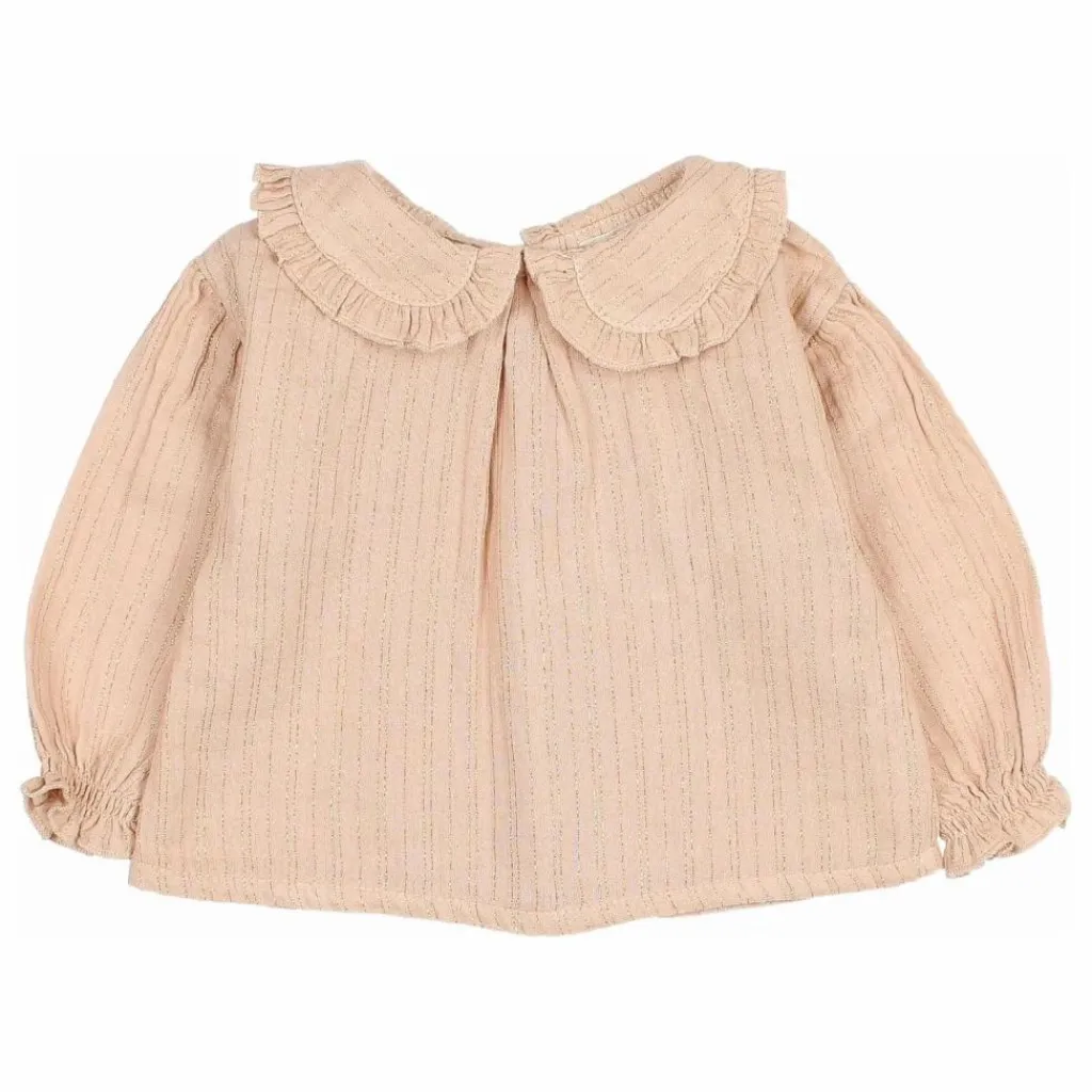 - Chemisier en double gaze et lurex à fines rayures. Col bénitier avec plis sur le devant. Fermeture par boutons au dos. Poignets avec élastique et volant.