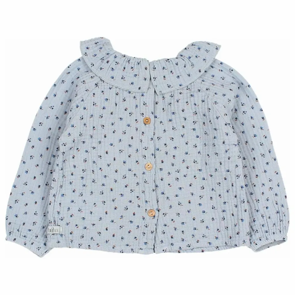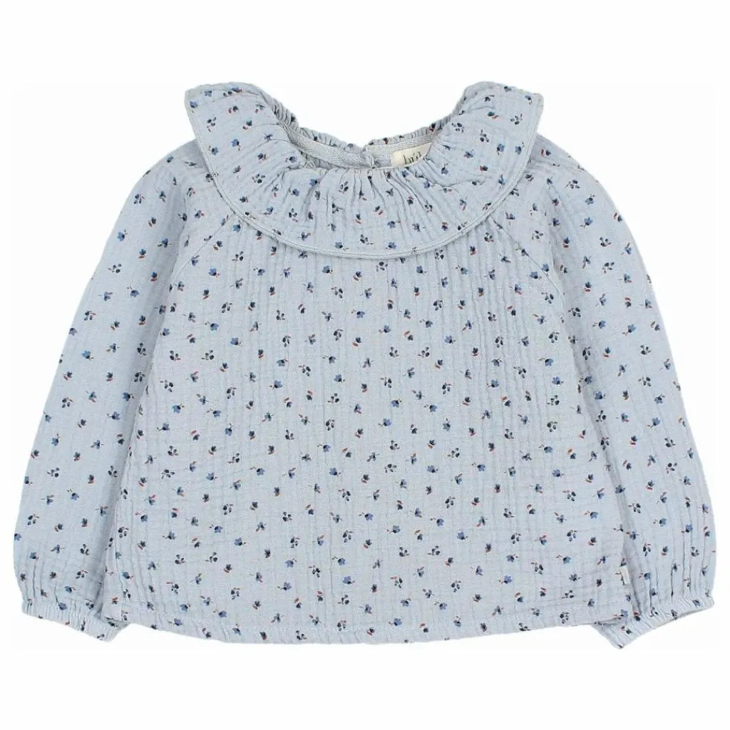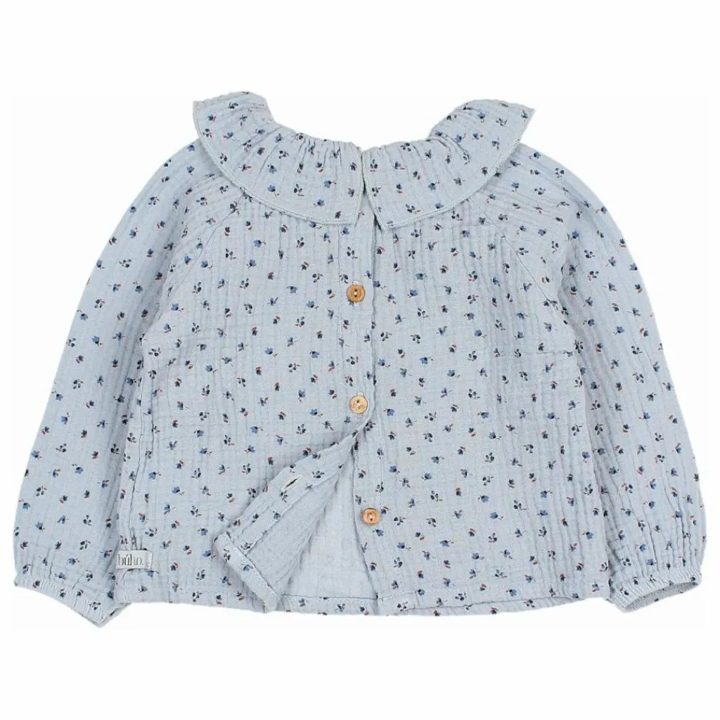 - Blouse en mousseline imprimée « Fall ». Encolure ronde avec volants. Fermeture par boutons au dos. Poignets élastiques.