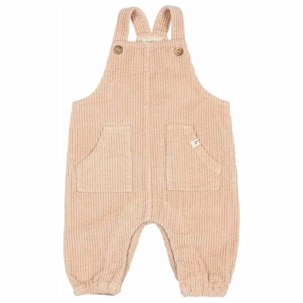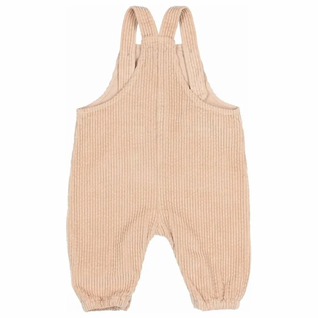 - Longue salopette en velours côtelé. Bretelles croisées avec fermeture par bouton en bois sur le devant. Poches plaquées sur le devant avec étiquette. Boutons-pression à l’entrejambe pour faciliter l’habillage. Bas élastiqué.