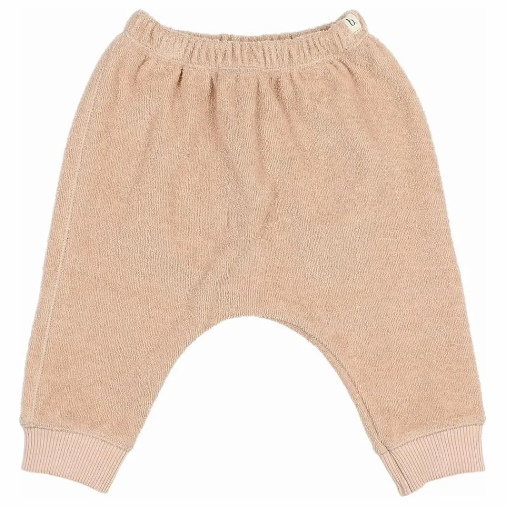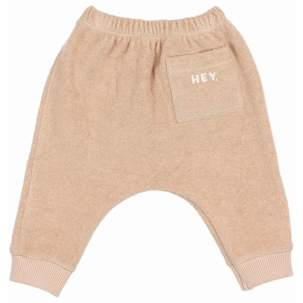 - Pantalon en éponge. Ceinture élastique. Poignets côtelés. Poche plaquée imprimée au dos. Étiquette sur la ceinture.