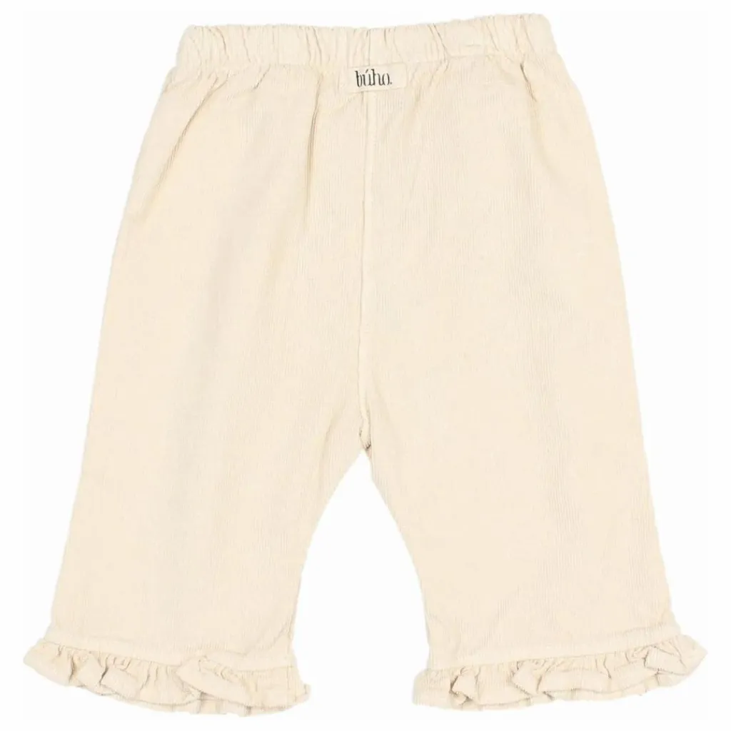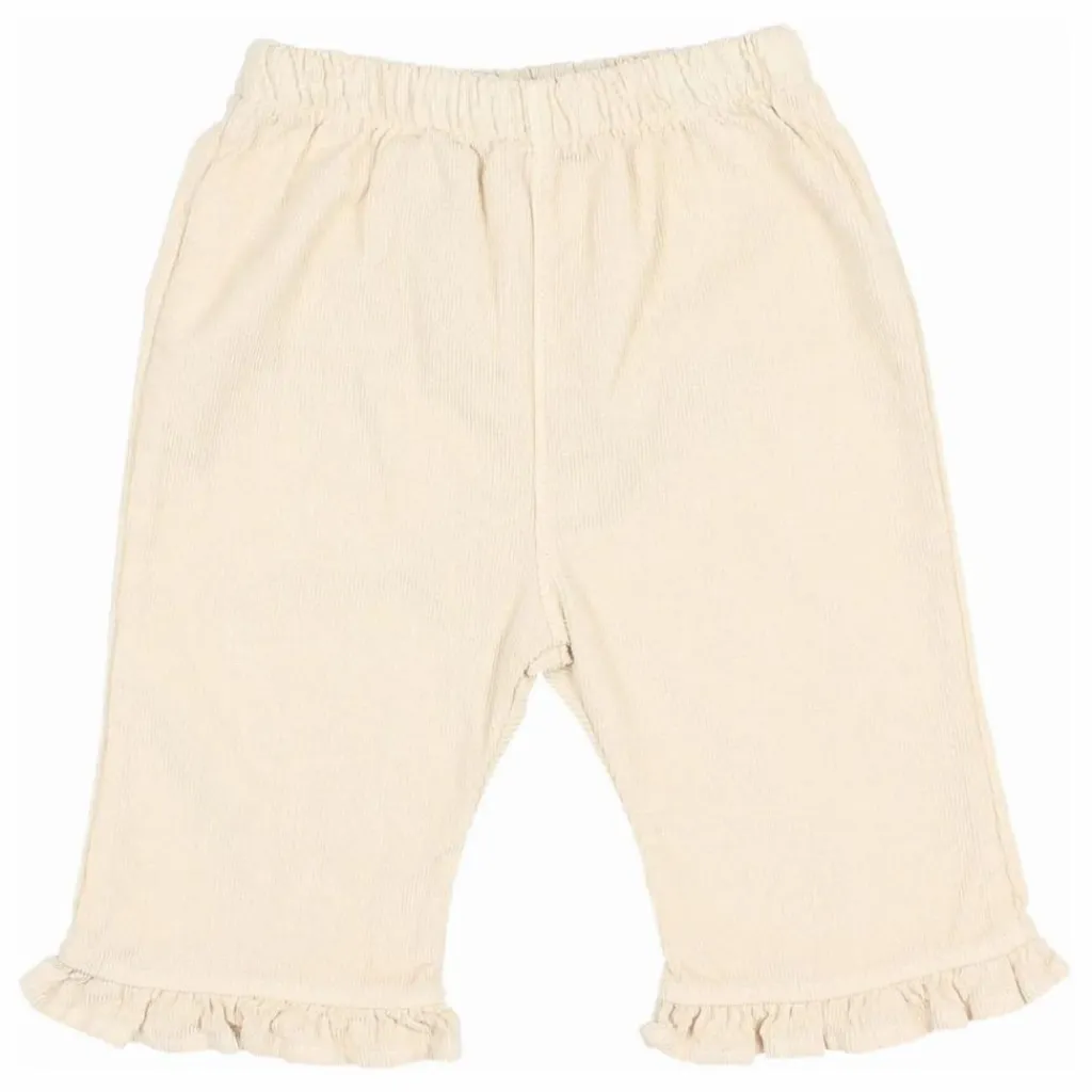 - Pantalon en micro velours côtelé. Taille élastique. Le bas du pantalon est agrémenté d’un volant.