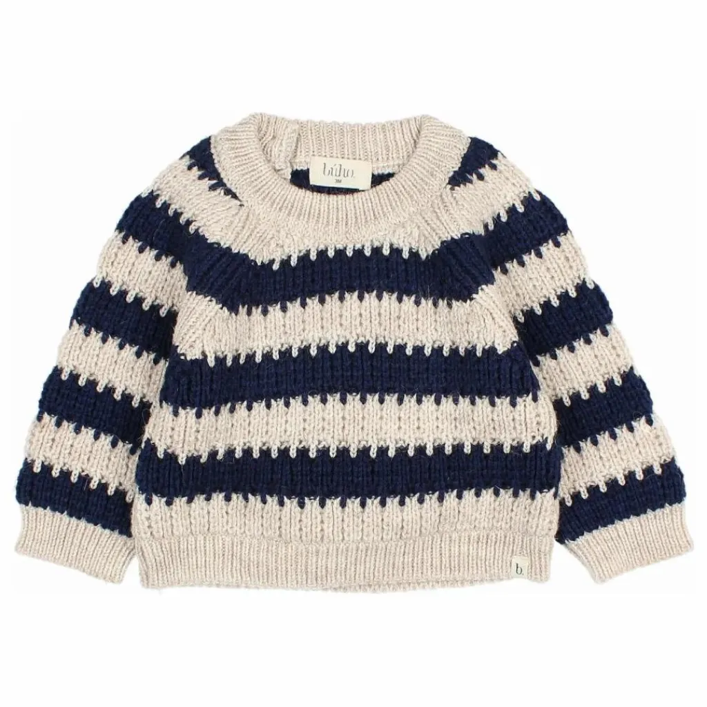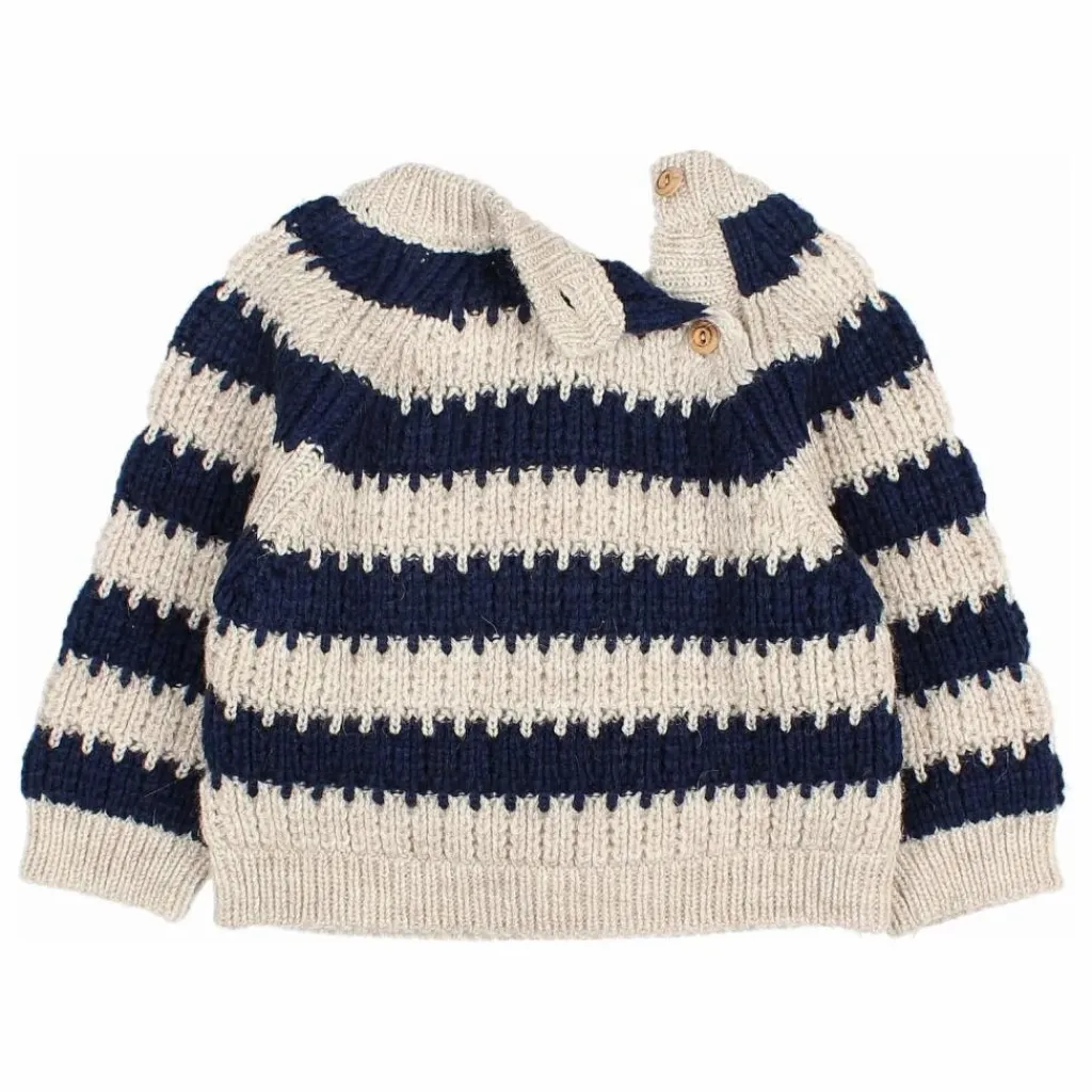 - Pull en maille rayée. Col rond avec ouverture boutonnée dans le dos. Manches raglan. Finitions côtelées. Étiquette sur l’ourlet.