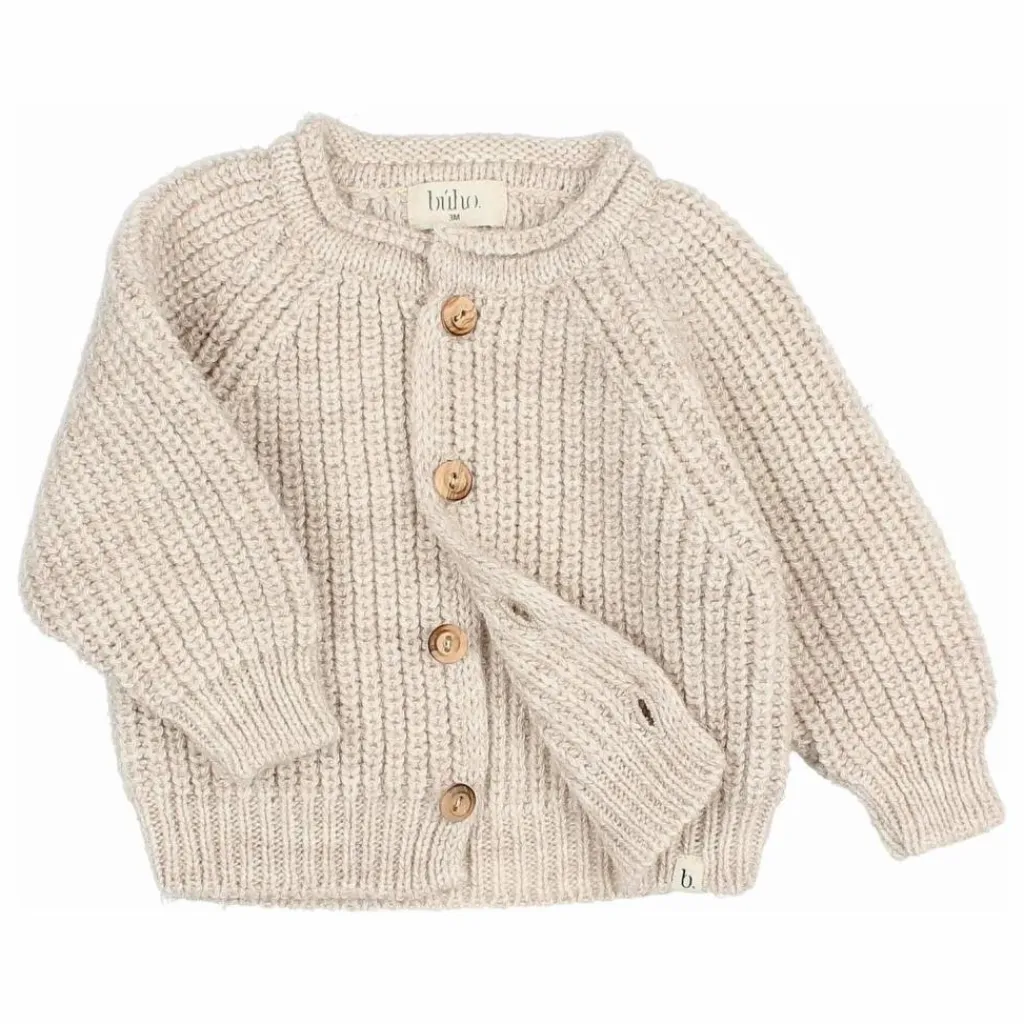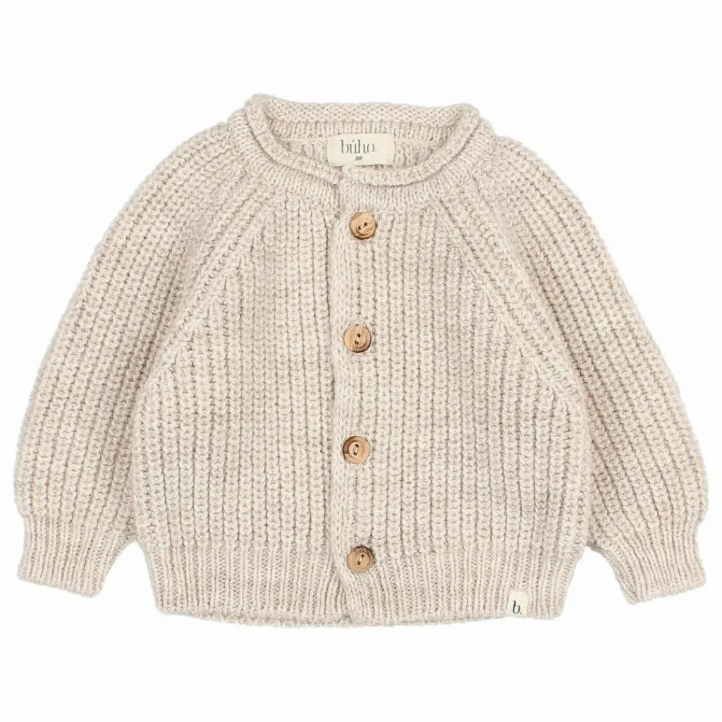 - Cardigan en maille douce. Col rond. Fermeture par boutons en bois sur le devant. Poignets et ourlets côtelés. Étiquette sur l’ourlet.