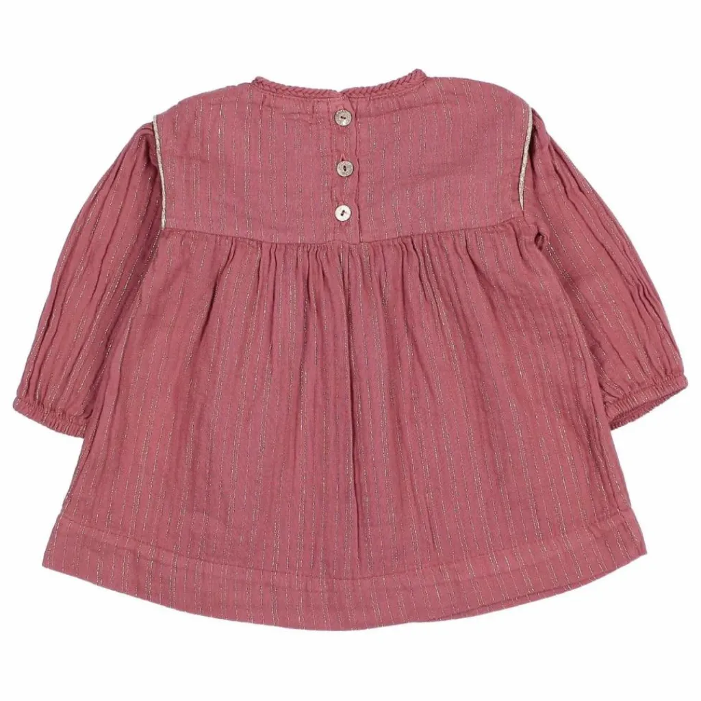 - Robe en double gaze de Lurex. Manches longues bouffantes et col rond avec finitions tressées. Fermeture par boutons au dos. Passepoil en Lurex sur l’empiècement et les emmanchures.