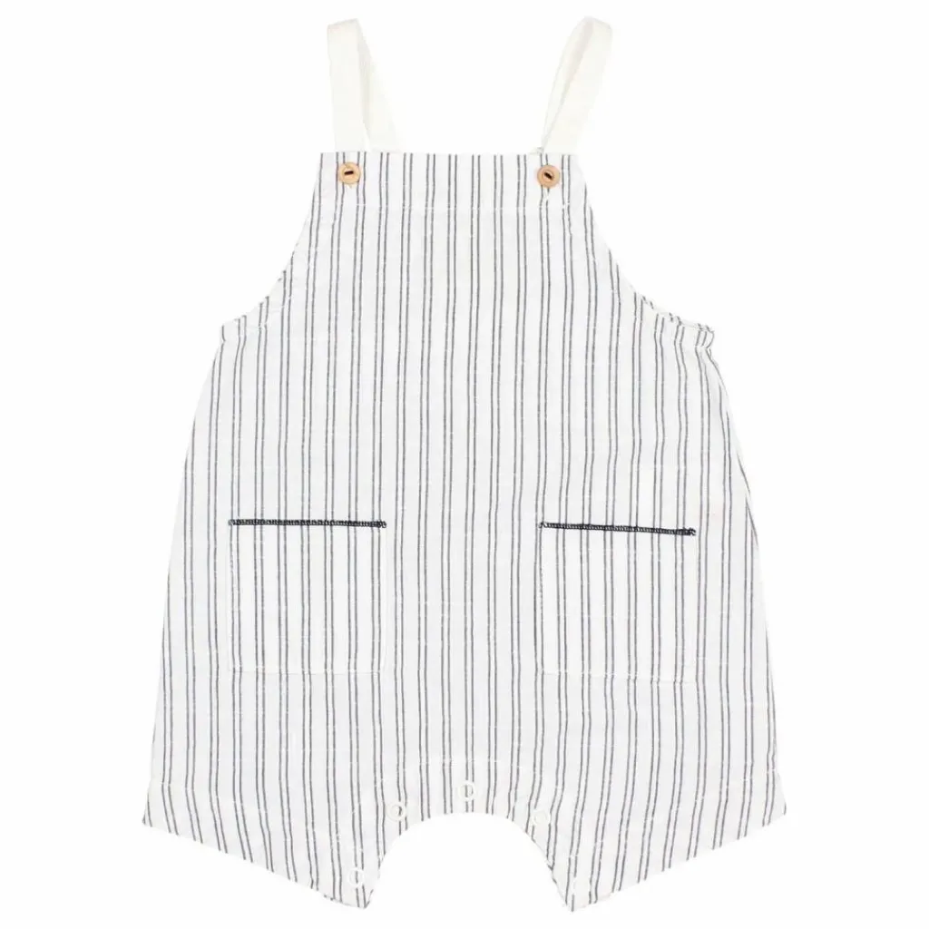 - Salopette rayée avec poches. Col droit. Bretelles croisées avec fermeture boutonnée sur le devant. Etiquette décorative au dos. Boutons-pression à l’entrejambe pour faciliter l’habillage.