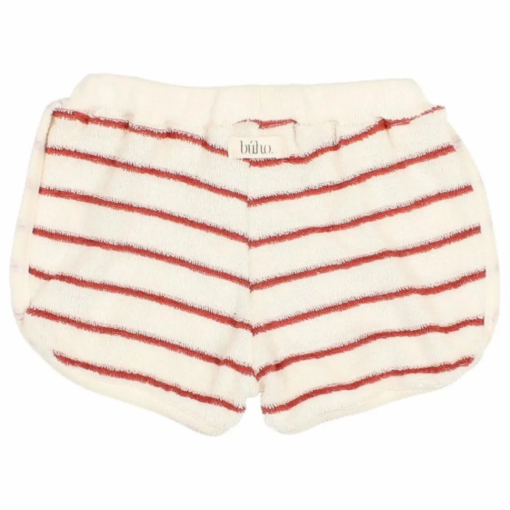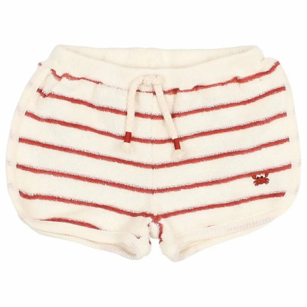 - Short rayé en tissu éponge. Taille élastiquée avec cordon de serrage. Crabe brodé sur le côté.