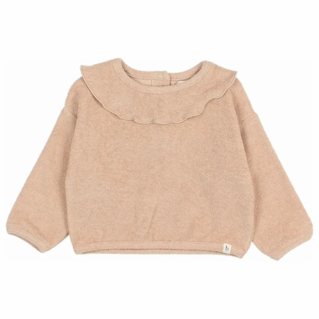 - Sweat en éponge « Girly ». Col rond avec volants. Fermeture par bouton pression au dos. Étiquette sur l’ourlet.