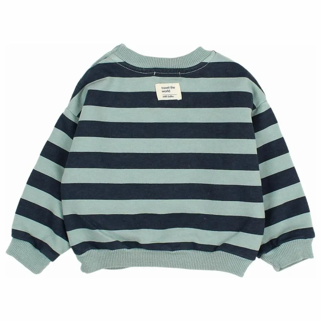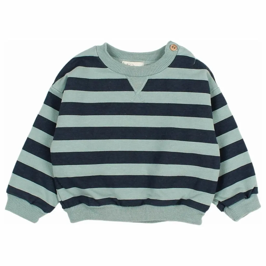 - Sweat-shirt rayé en polaire. Col rond avec insertion en V. Bouton en bois à l’épaule. Etiquette décorative au dos. Finition côtelée.