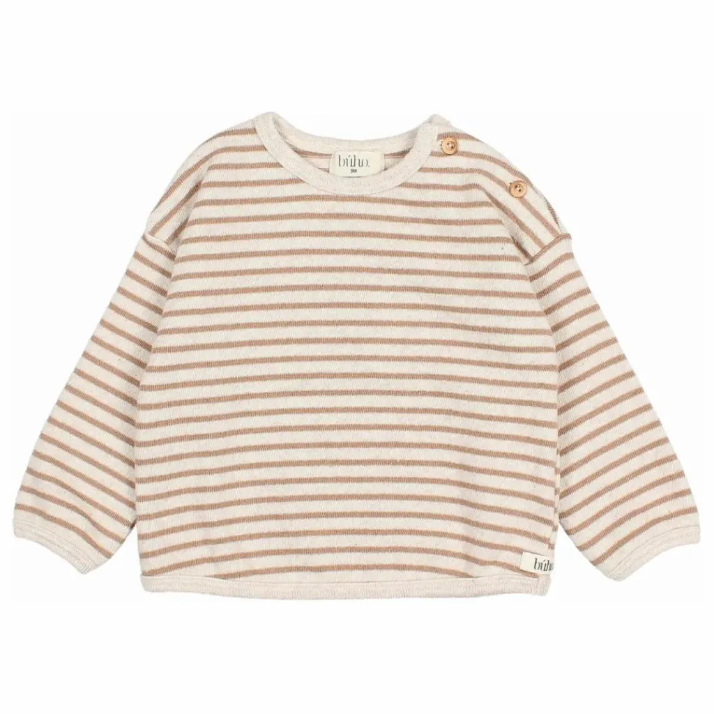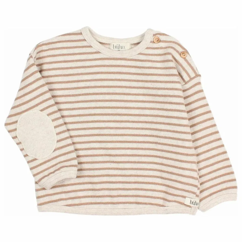 - Sweat-shirt rayé en maille douce. Col rond avec fermeture par bouton en bois à l’épaule. Empiècements contrastés aux coudes.