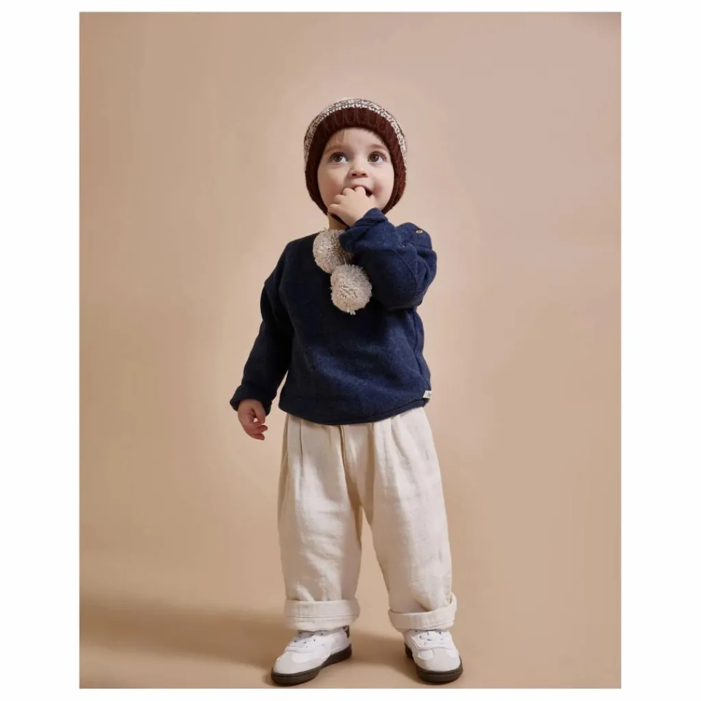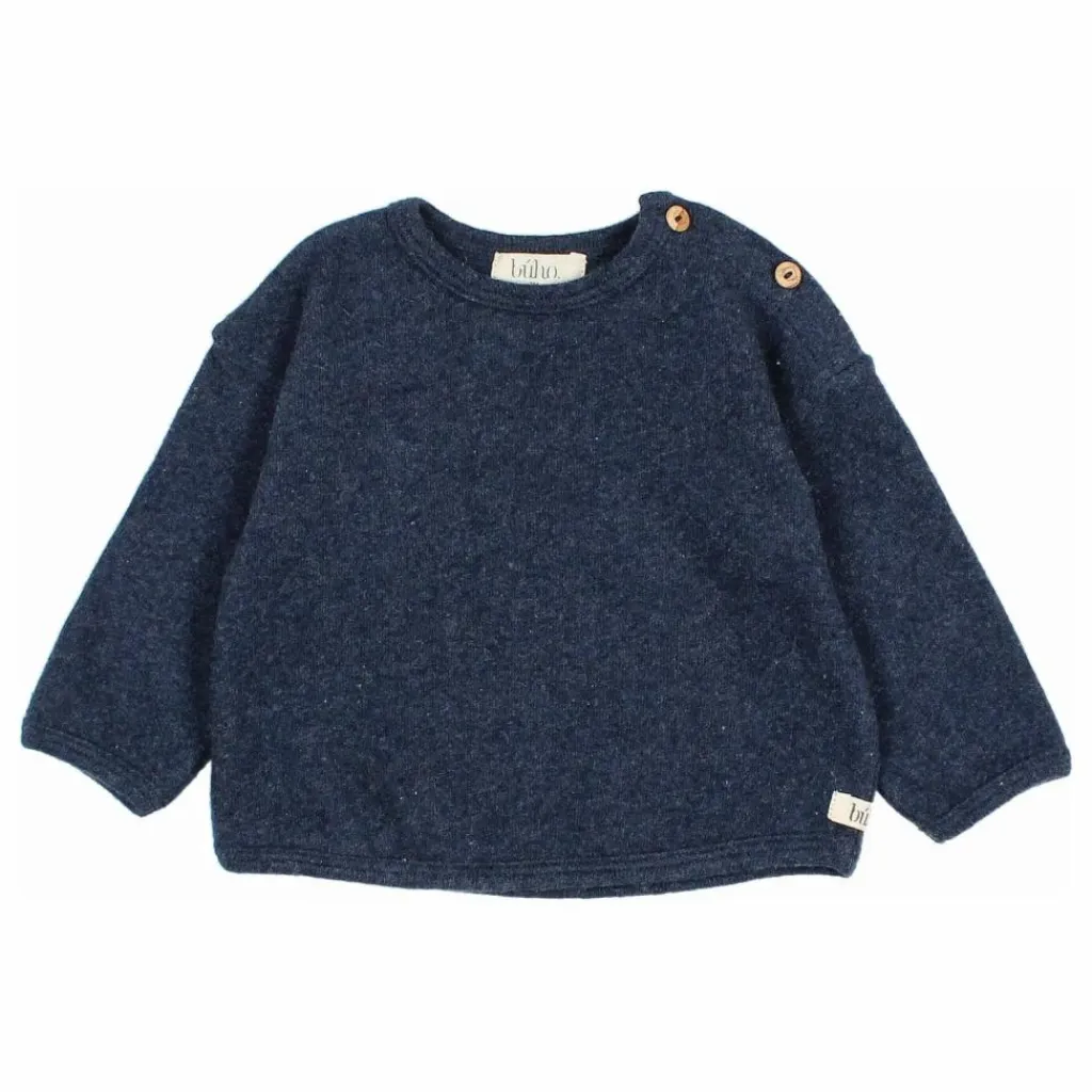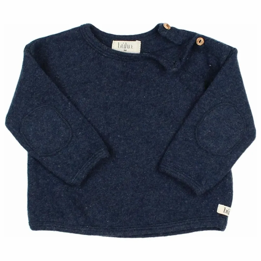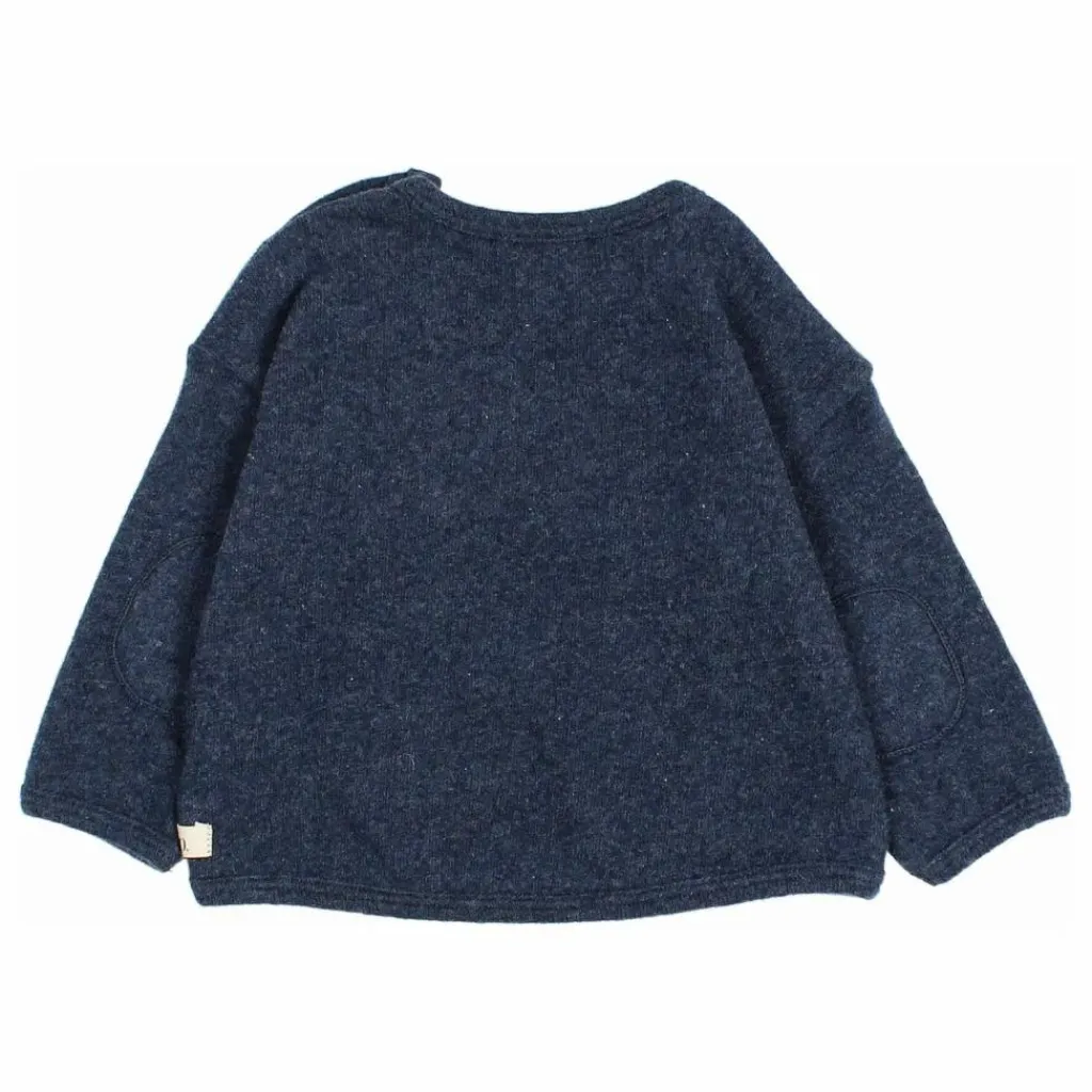 - Sweat en tricot doux. Col rond avec fermeture à l’épaule par un bouton en bois. Empiècements aux coudes dans la même couleur.