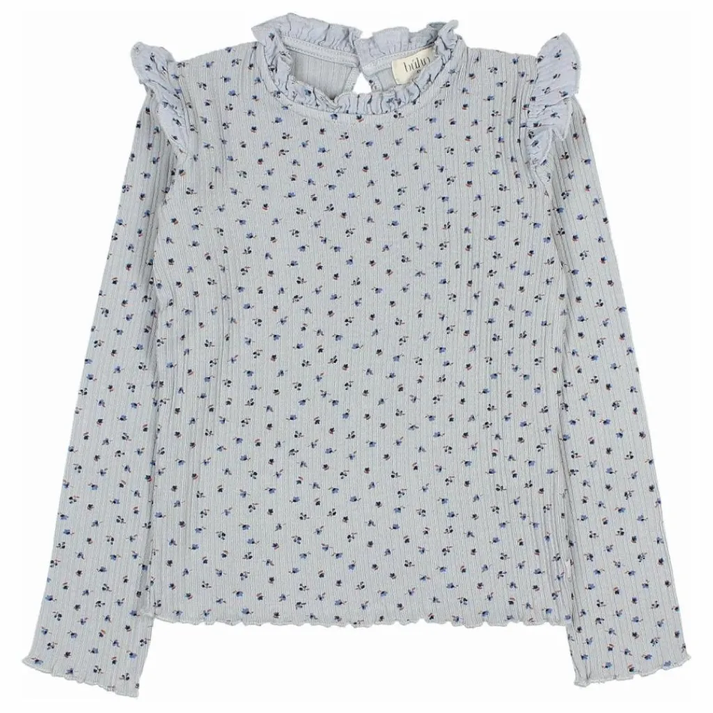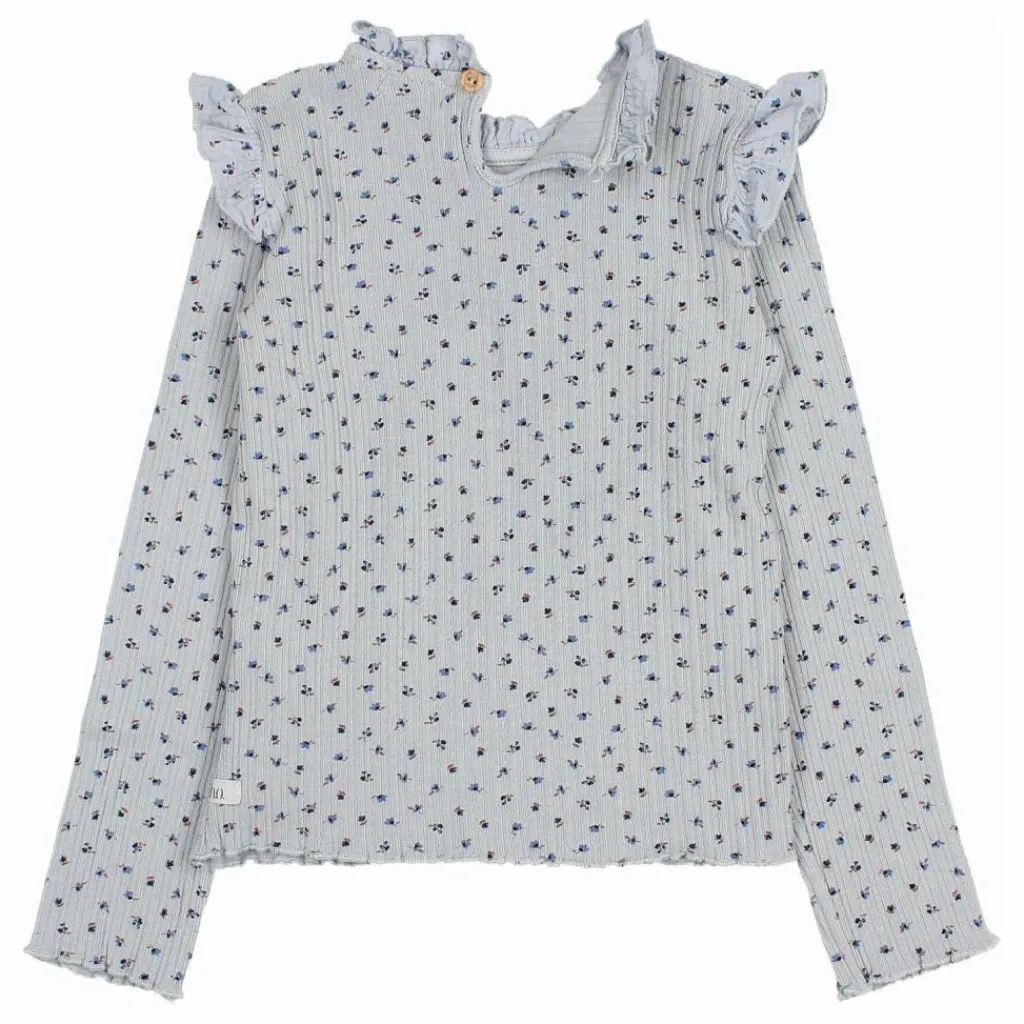- T-shirt à manches longues côtelées avec imprimé « fall ». Ouverture en goutte d’eau au dos. Volants en mousseline sur les épaules et le col.