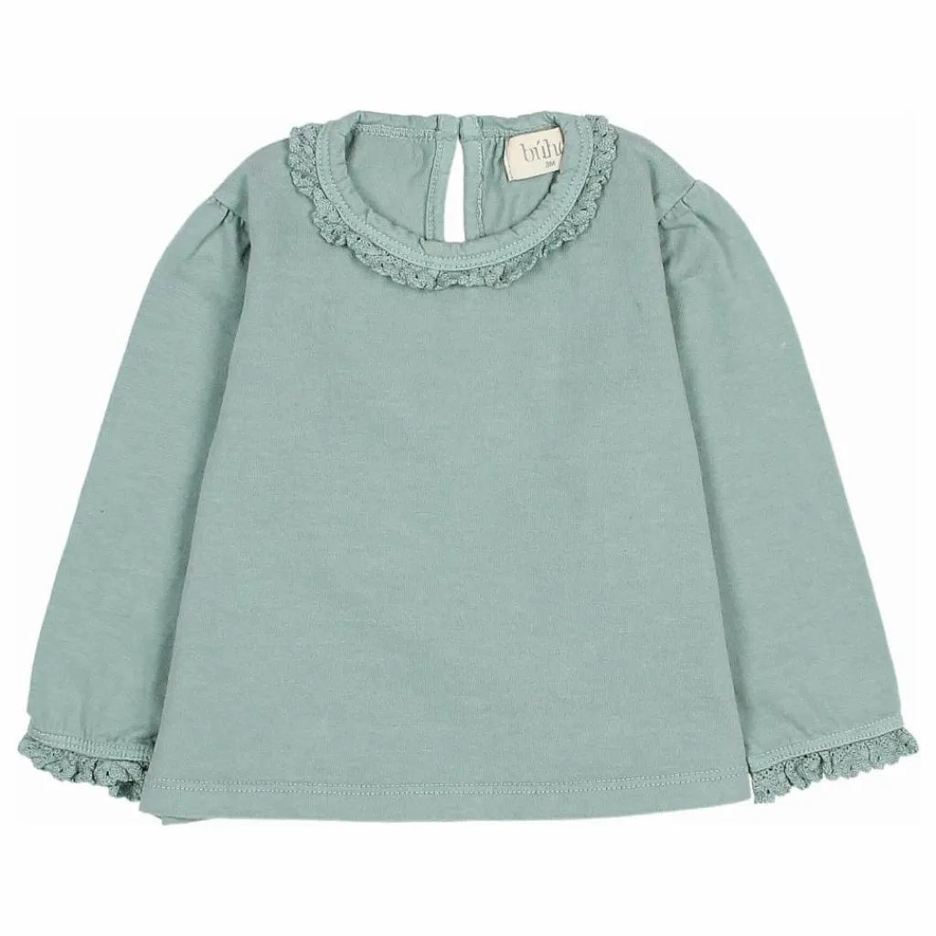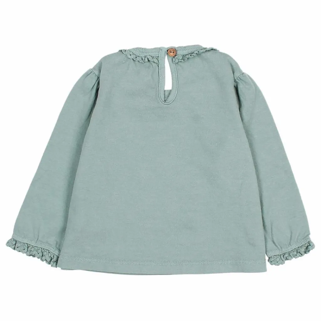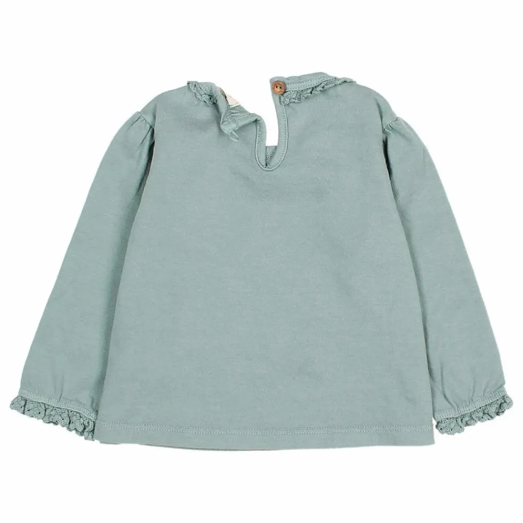 - T-shirt bouffant à manches longues. Détails en dentelle de coton au niveau du cou et des poignets. Encolure ronde avec fermeture en goutte d’eau au dos.