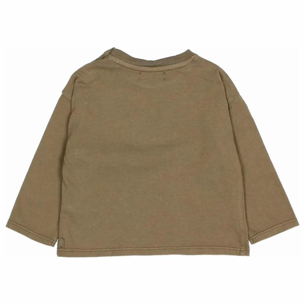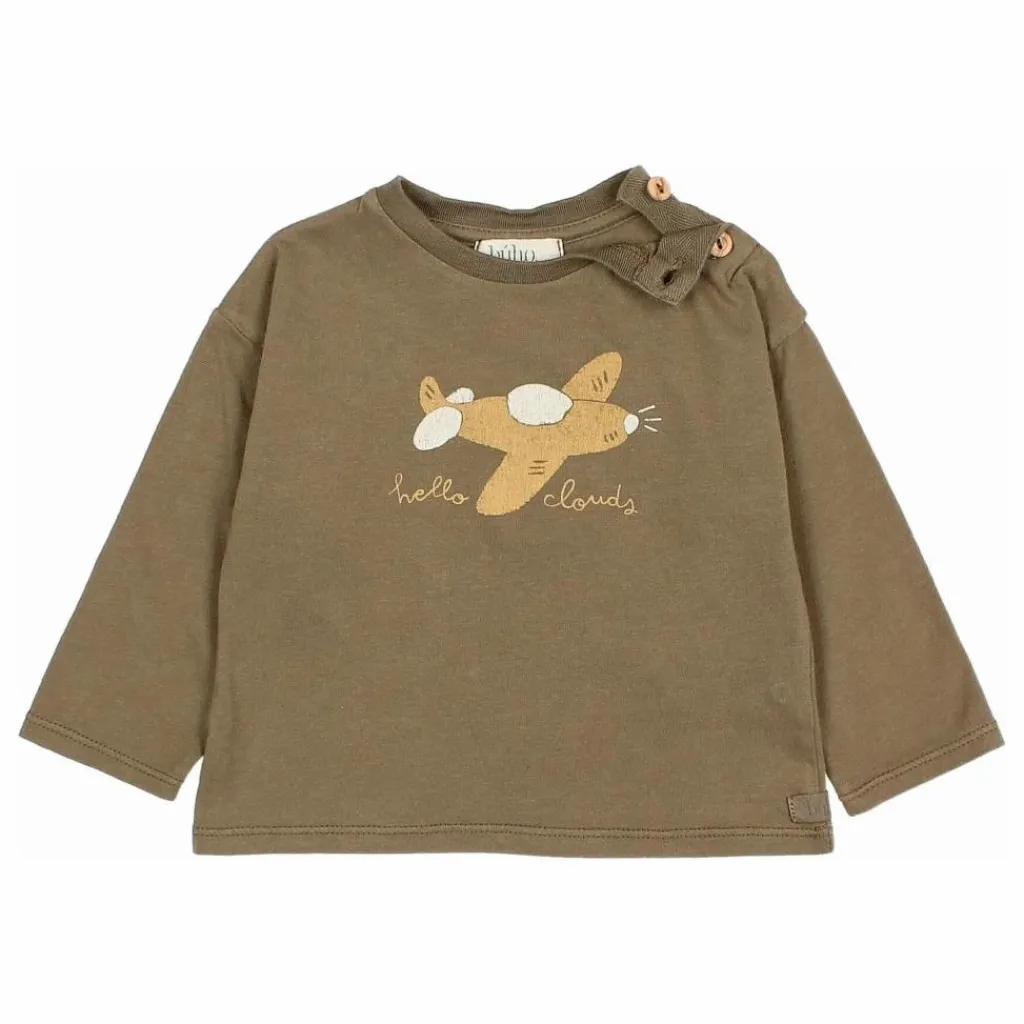 - T-shirt avec impression d’avion sur le devant. Manches longues. Col rond avec fermeture à l’épaule par un bouton en bois.