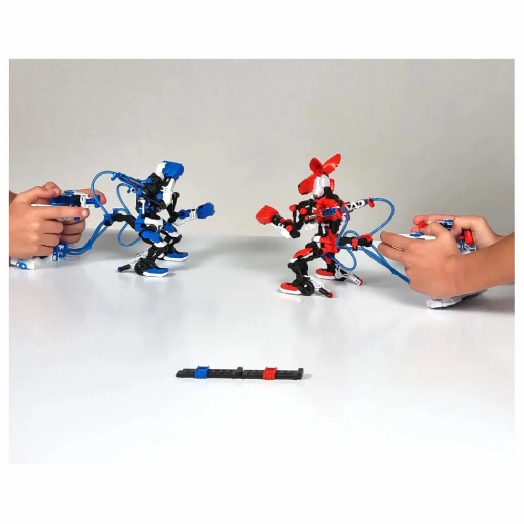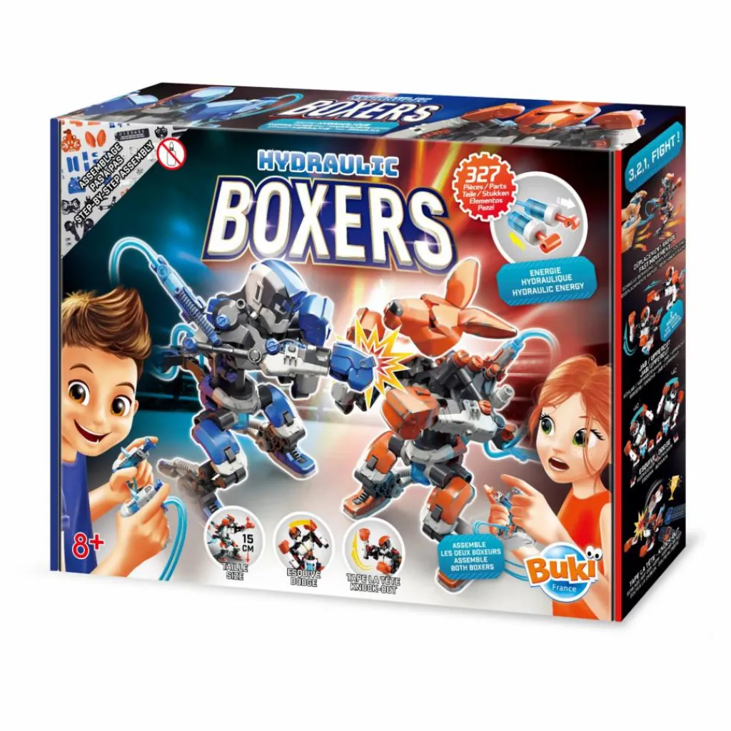 Deux boxeurs à assembler qui fonctionnent à l’énergie hydropneumatique. Vos enfants utilisent les manettes pour les articuler : crochet, uppercut, contre et esquive. Un coup bien placé permet de faire sauter la tête de son adversaire.
