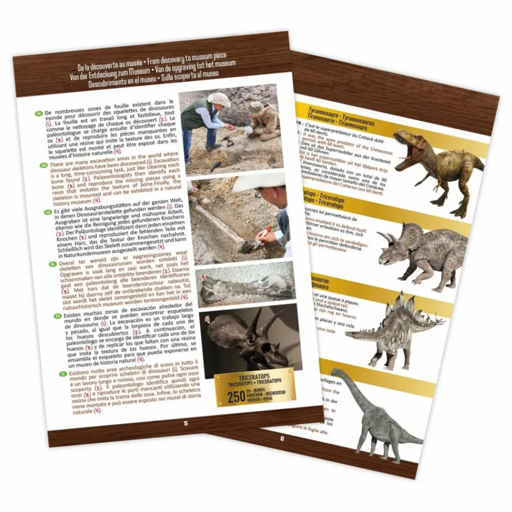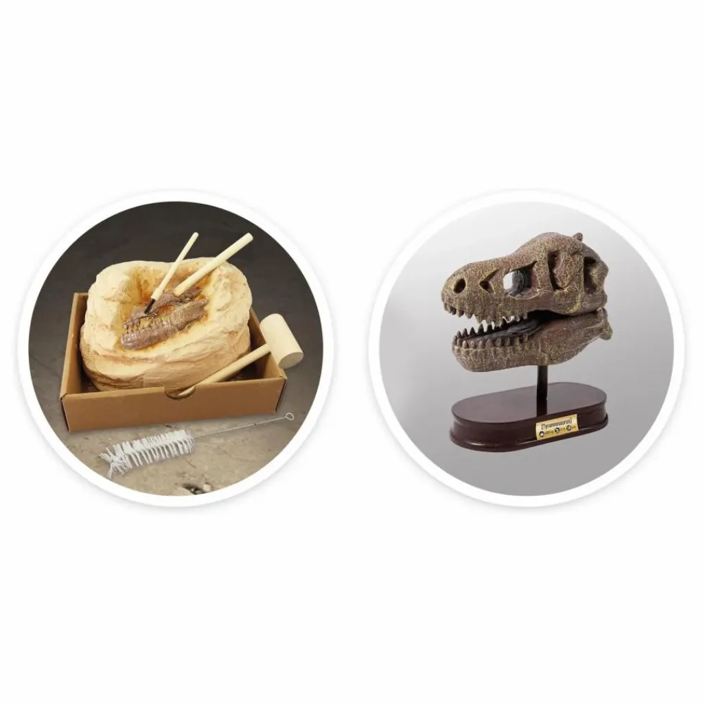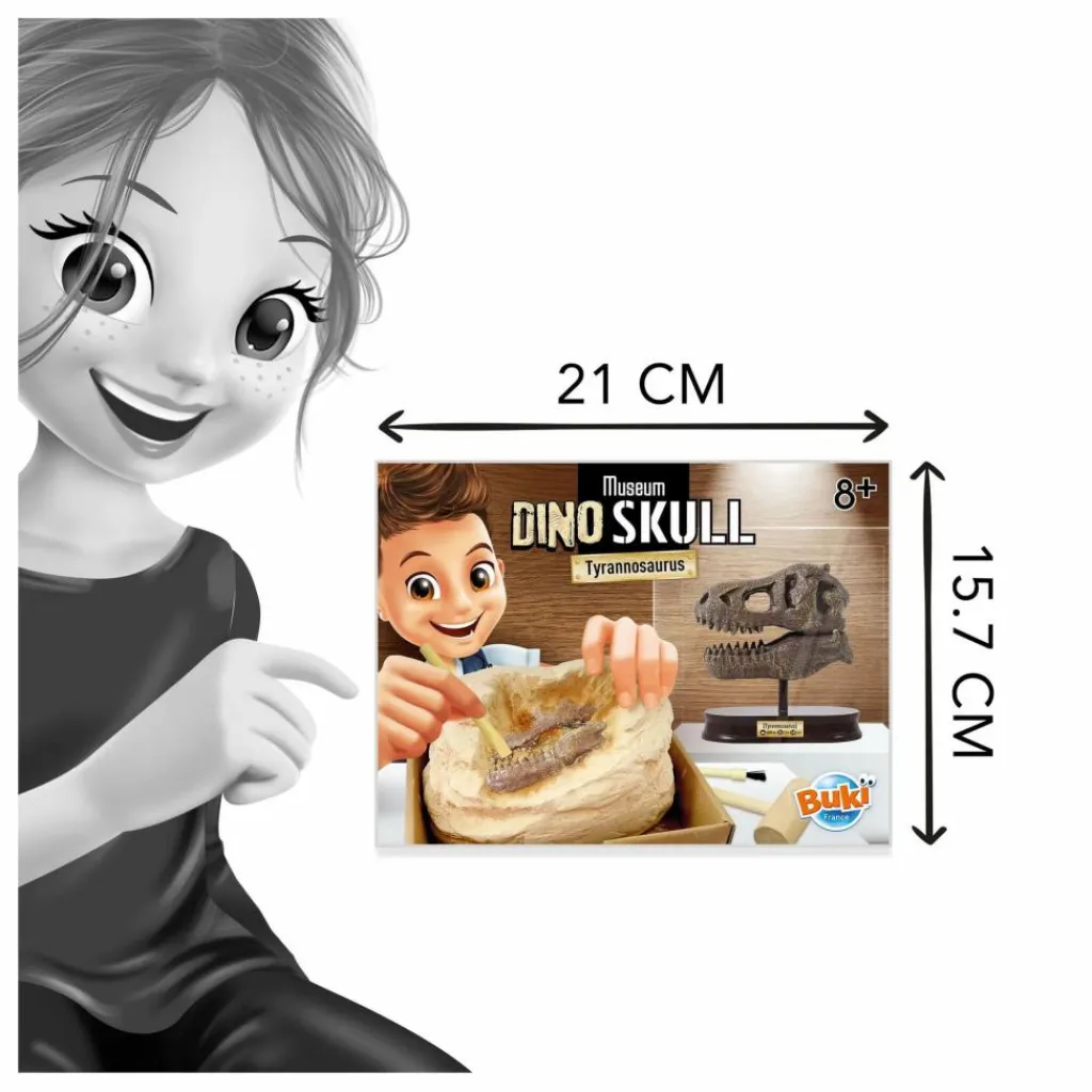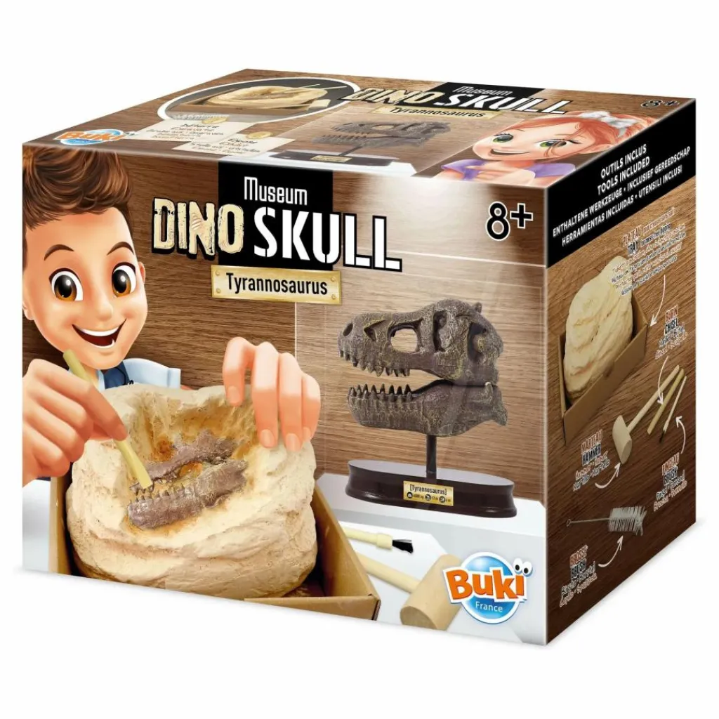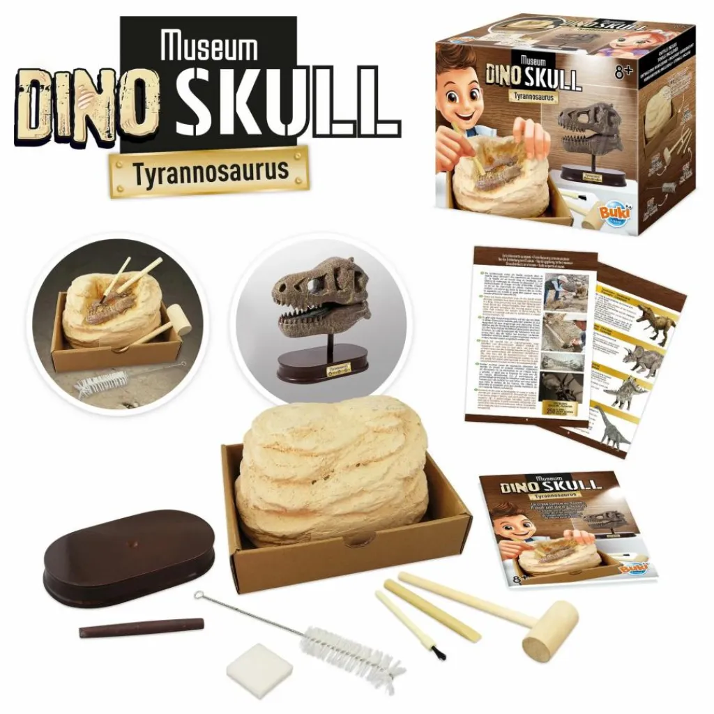 Inclus : un plateau pour creuser sans salir. Le crâne de dinosaure peut être exposé sur un support comme au musée.