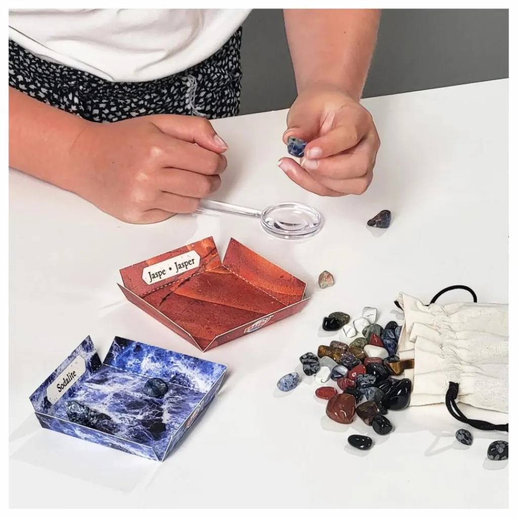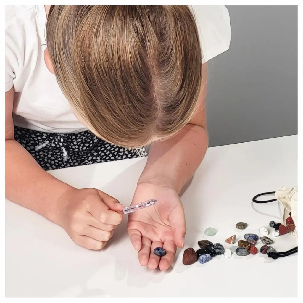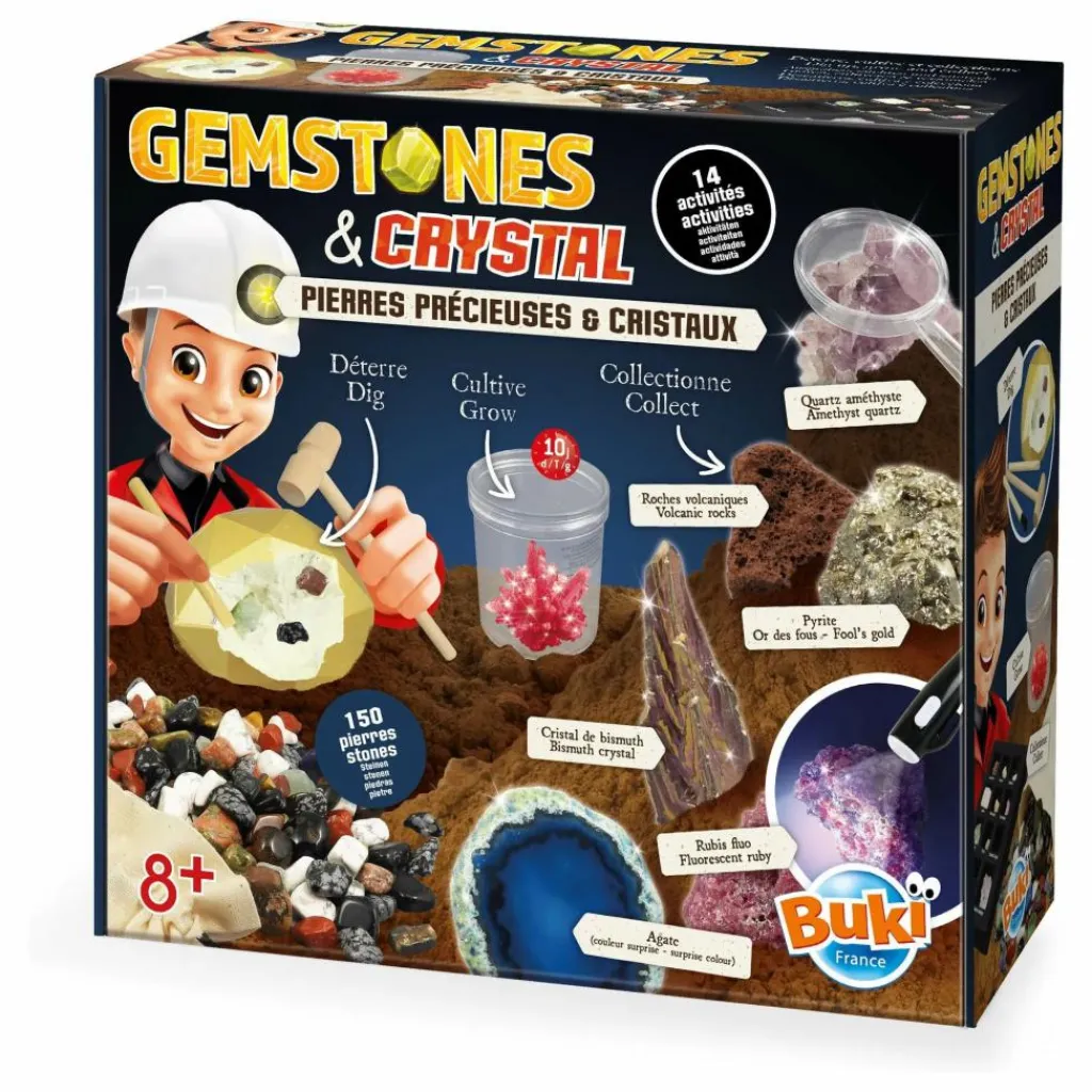- Deviens un expert des pierres précieuses et des cristaux avec les 27 pierres authentiques incluses. Réalise des expériences pour découvrir leurs propriétés. Avec les outils, déterre 8 véritables pierres brutes. Trouve leurs versions polies dans le sac (300 g) et compare-les avec la loupe.