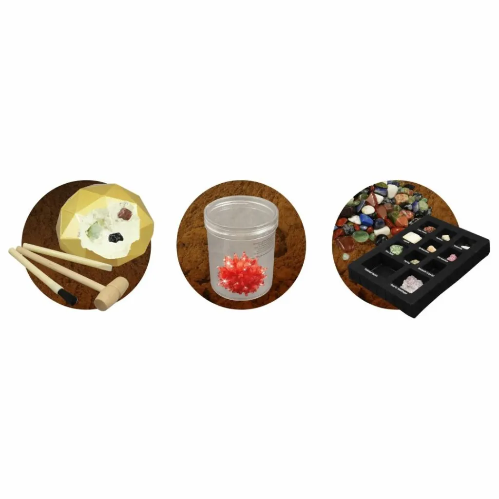 Fais pousser des cristaux géants et des cristaux instantanés. Observe une grande variété de roches remarquables : pierres volcaniques, quartz, or des fous, roche fluorescente, agate polie, cristal de bismuth…