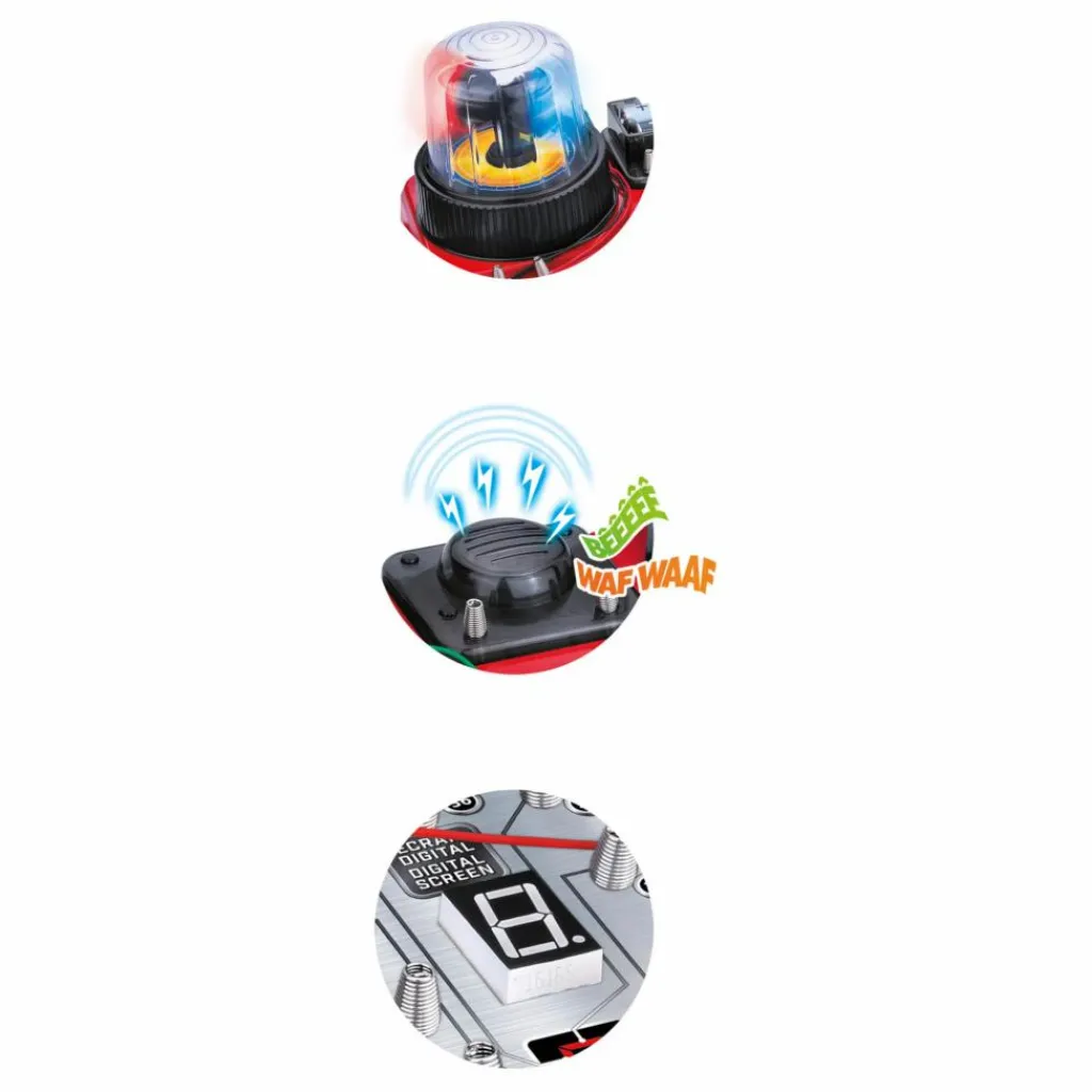 - 1 console de montage, 1 aimant, 8 fils de connexion 10 cm, 5 fils de connexion 20 cm, 5 fils de connexion 30 cm,1 livret, 1 base du porte-mémo, 1 support du porte-mémo, 1 base du gyrophare, 1 support DEL, 1 ampoule DEL, 1 pivot central, 1 cache rouge et bleu, 1 engrenage, 1 moteur, 1 support du gyrophare, 1 capot transparent, autocollants, 1 joint, 1 ressort, 1 boîtier à piles, 1 haut-parleur.