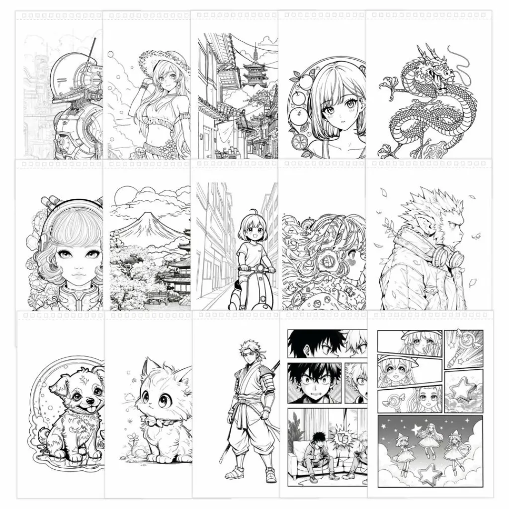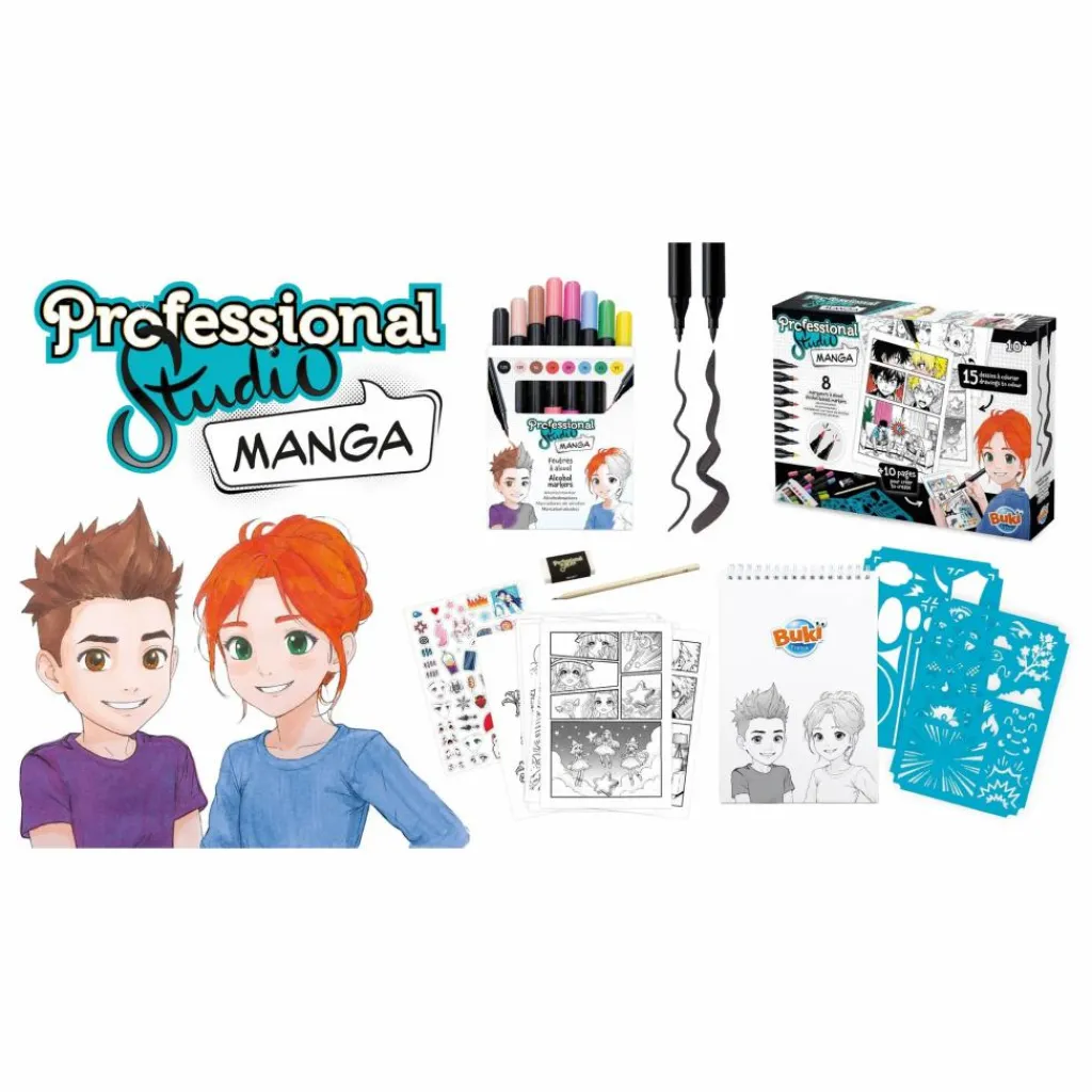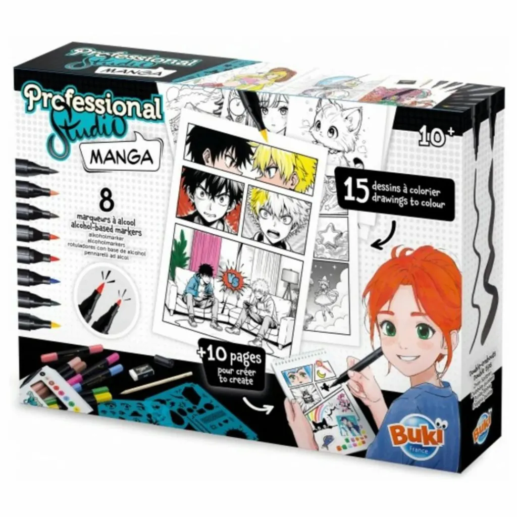 Le coffret contient : un carnet format A5 avec 25 feuilles détachables dont 15 mangas à colorier et 10 feuilles vierges, 8 feutres à l’alcool, 1 crayon de papier, une gomme, deux planches de pochoirs et une planche de stickers.
