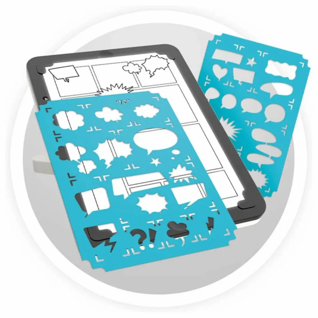 Fonction BD/Manga : Place une feuille, utilise les pochoirs pour créer tes planches vierges puis dessine, ajoute des stickers et créé tes histoires.