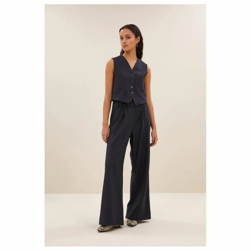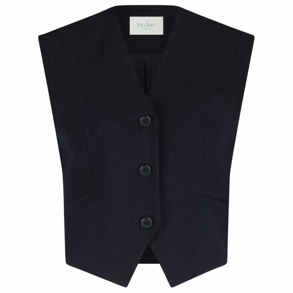 - L’essentiel de cette saison, le gilet Lynn Pinstripe. Ce gilet est fabriqué en un mélange doux de viscose, polyester et élasthanne. Le gilet a un décolleté en V avec une coupe ajustée. Il dispose également d’une fermeture à boutons et d’un motif à rayures fines.
