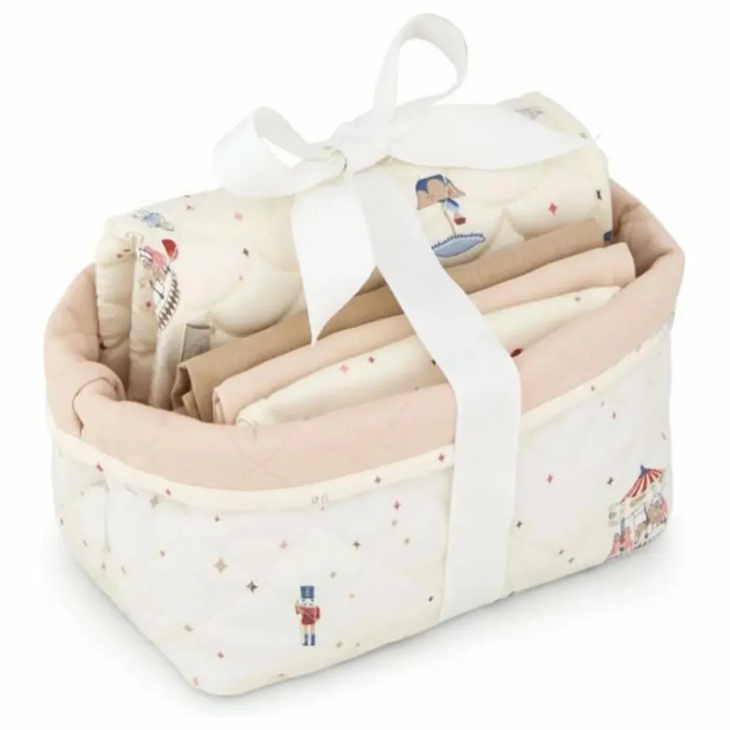 Un panier de rangement molletonné (la plus grande taille de notre lot de 2) idéal pour ranger les accessoires de change, un ensemble de 2 bavoirs bandana, un tapis à langer portatif pour répondre aux besoins de la famille active, ainsi qu’un ensemble de deux langes en mousseline colorée unie. Disponible dans des imprimés variés. Un incontournable pour les jeunes parents et le coffret cadeau parfait !