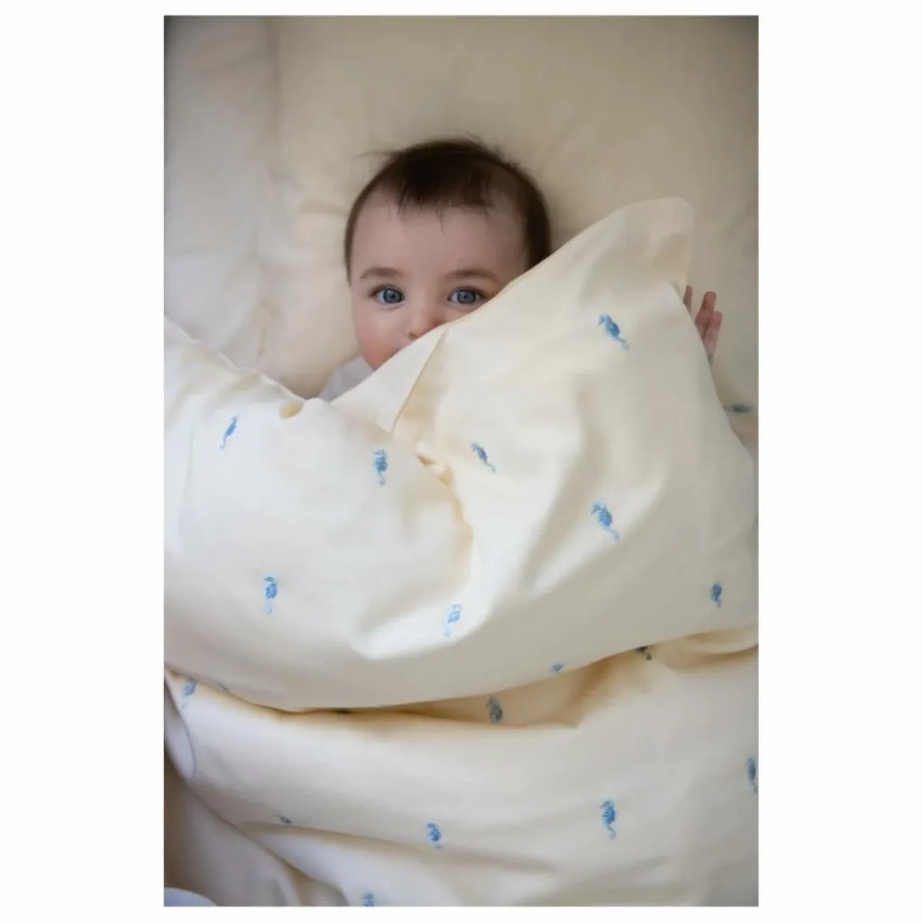 - Enveloppez votre bébé d’une douceur et d’un style extraordinaires avec notre linge de lit pour bébé brodé au motif serein de Sea Garden. Fabriquée en coton biologique certifié GOTS, cette literie exclusive est ornée de délicates broderies représentant de magnifiques hippocampes qui apporteront une grâce harmonieuse à la chambre de votre bébé et lui feront faire de tendres rêves. La douceur luxueuse du coton sateen 100 % biologique garantit un sommeil douillet et réparateur à votre enfant. Rehaussez votre chambre d’enfant avec cette pièce de collection élégante et pratique, destinée à être conservée, chérie et transmise de génération en génération. C’est le cadeau idéal pour les fêtes de fin d’année et les naissances.