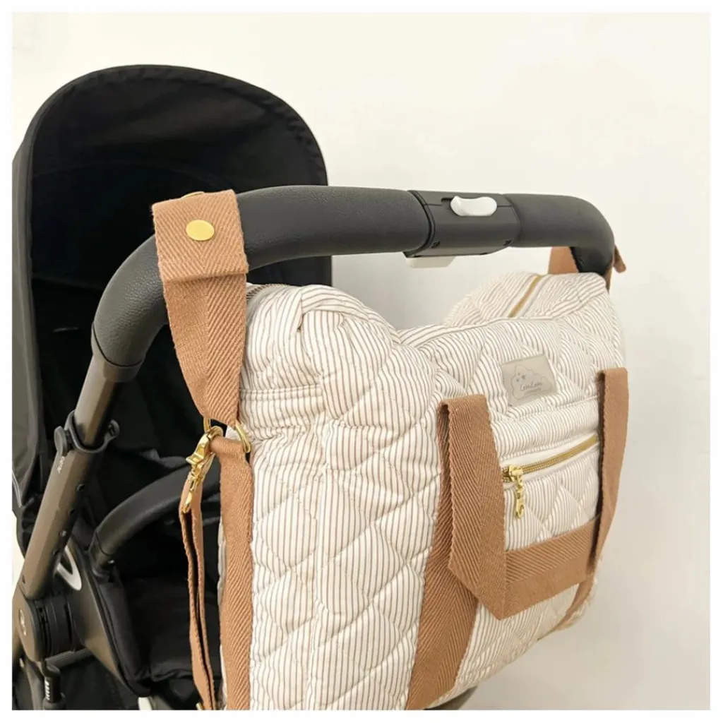 - Notre populaire sac à langer est doté d’un élégant matelassage et d’un revêtement hydrofuge à l’extérieur et à l’intérieur pour une protection et une longévité accrues. Le sac est doté de lourdes sangles, d’une bandoulière réglable et de deux petites poignées permettant de l’attacher à la poignée du landau ou de la poussette.