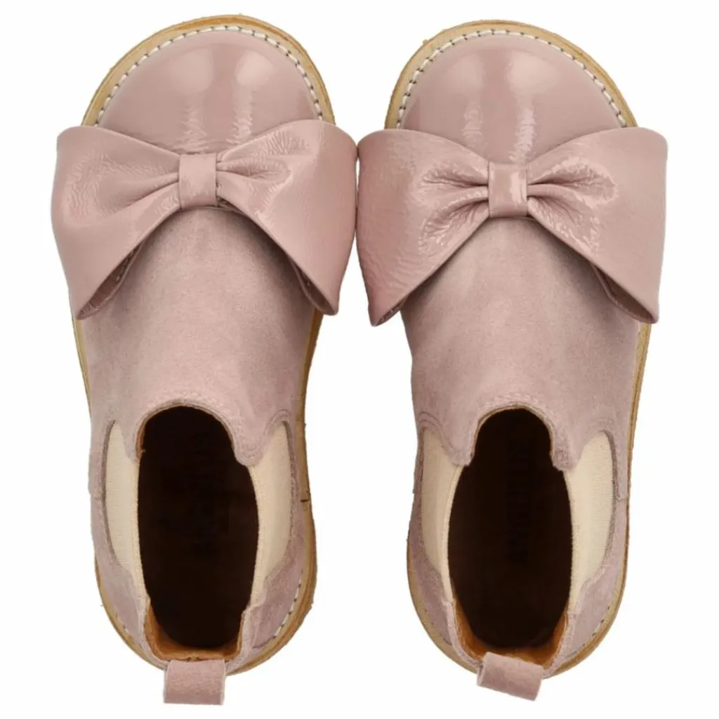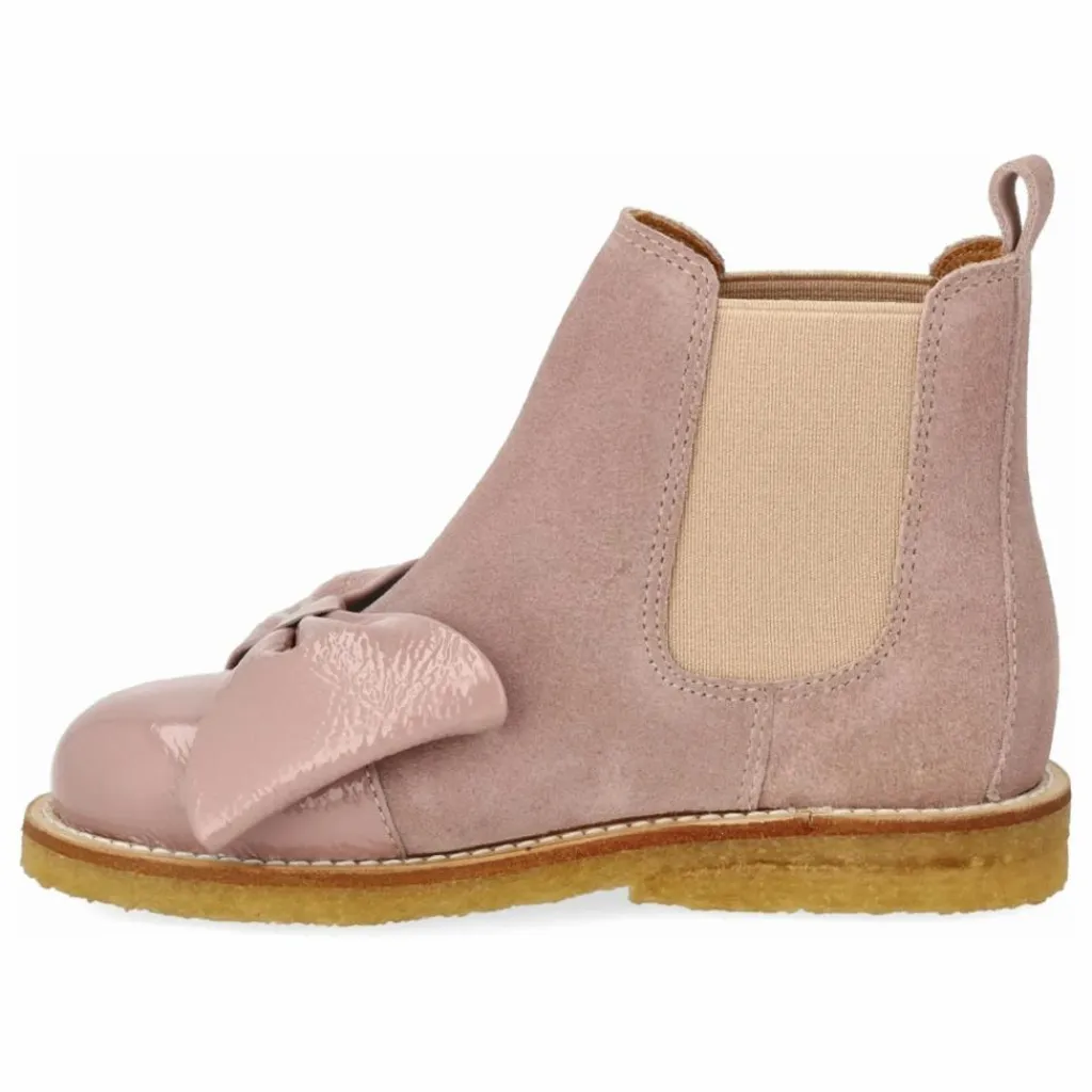 - Botte Chelsea en daim avec nœud et boucle en cuir verni.