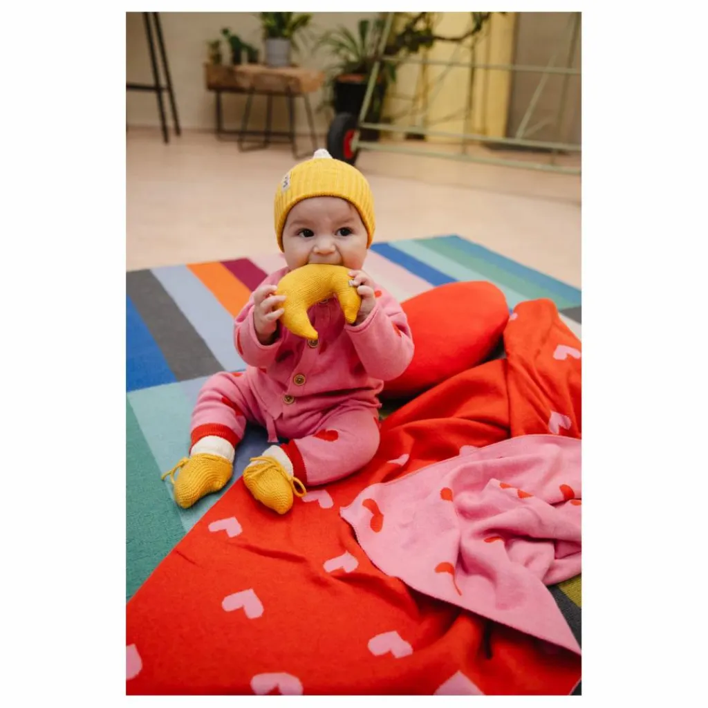 - Un cardigan très amusant ! Il a une forme carrée et des manches à petits bords roulés avec de jolis boutons en bois. Créez votre tenue en l’associant à notre pantalon tricoté ou à la culotte bouffante assortie.