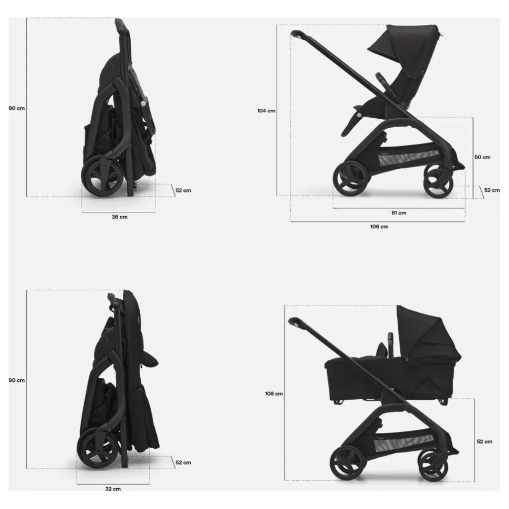 Pliage en 1 élément avec nacelle : Longueur : 32 cm, Largeur : 52 cm, Hauteur : 90 cmDimensions poussette dépliée : Longueur : 106 cm, Largeur : 52 cm, Hauteur : 104 cm