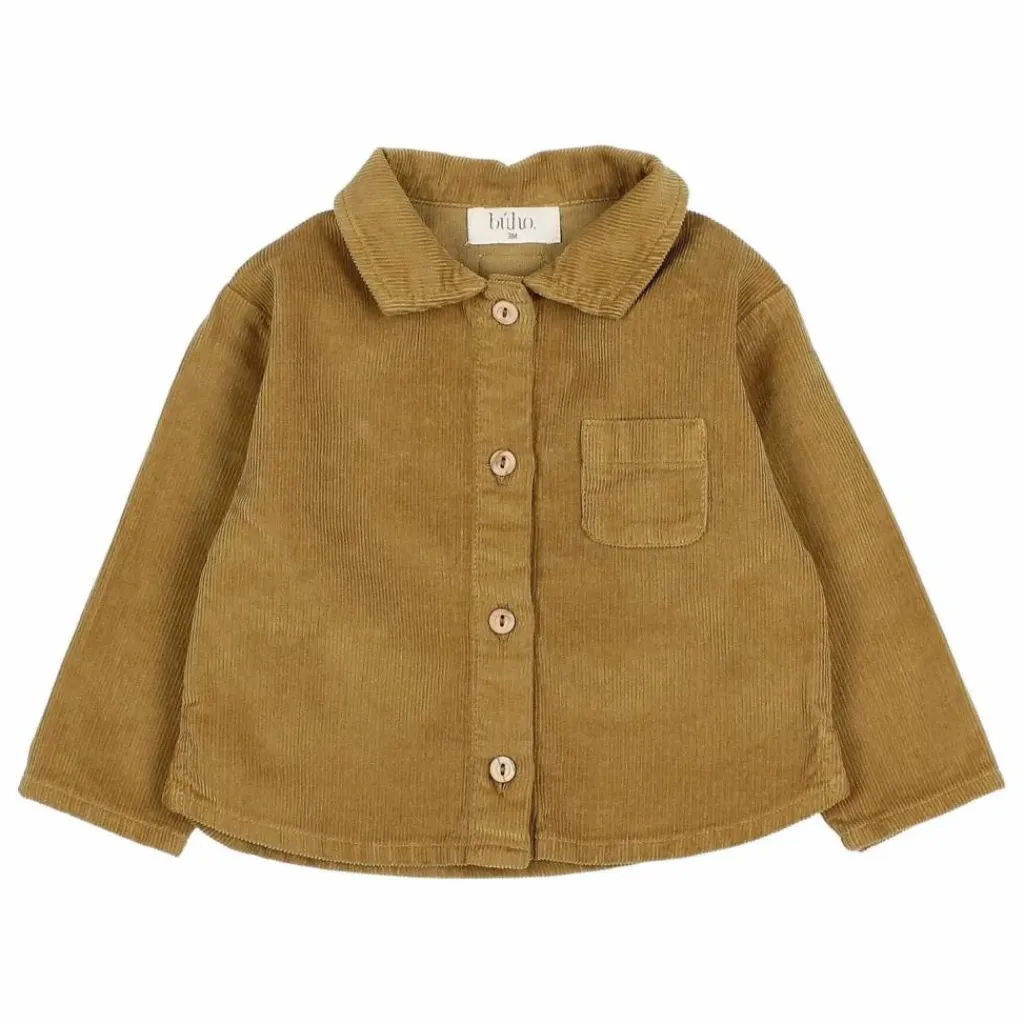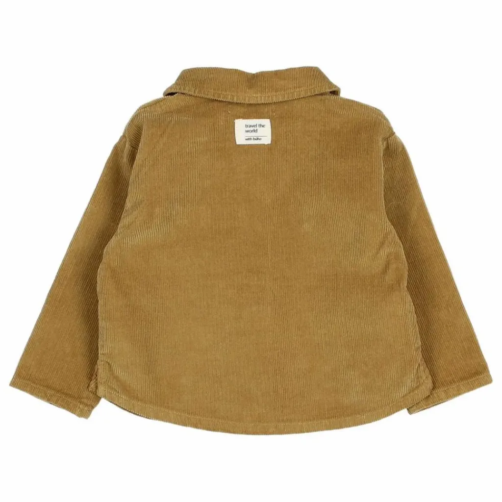 - Chemise en micro velours côtelé. Col chemise. Fermeture boutonnée en bois sur le devant. Poche Plastron sur la poitrine. Etiquette décorative au dos.